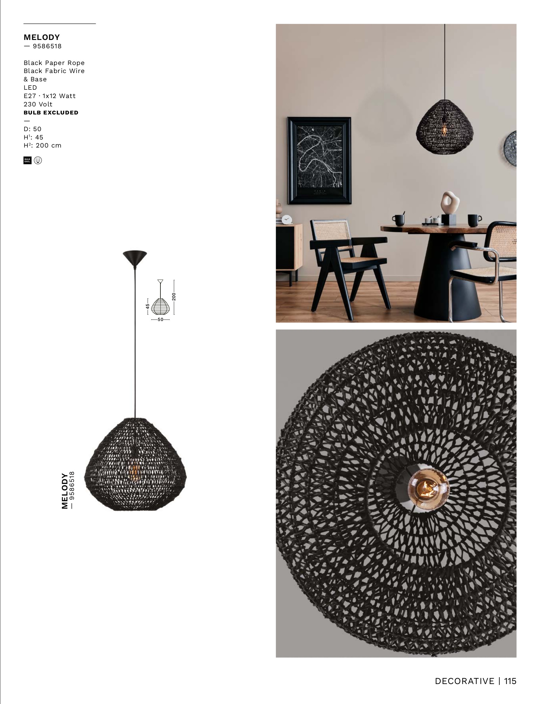Осветителното тяло 9586518 ще осигури комфорт и естетика във всяко помещение, в което се постави. Цялостната визия и дизайн на лампата и вложените в изработката й материали, като въже от усукана черна хартия, кабел от PVC с черна текстилна оплетка, ще допринесат за един неповторим стил. Благодарение на дългогодишния опит, качествените материали и строгия контрол на качеството на изработка на производителя Nova-Luce (Гърция), 9586518 е на високо европейско ниво.