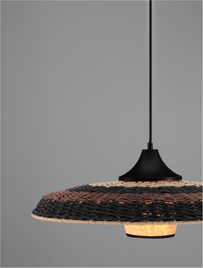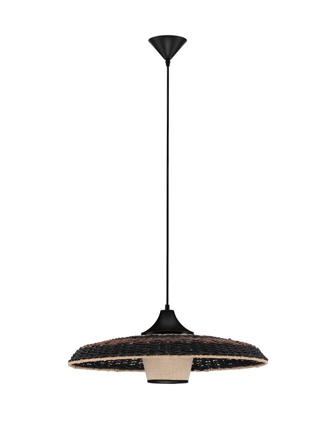 оцветен ратан (натурален, черен и кафяв цвят), PVC кабел с черна текстилна оплетка, черен метал