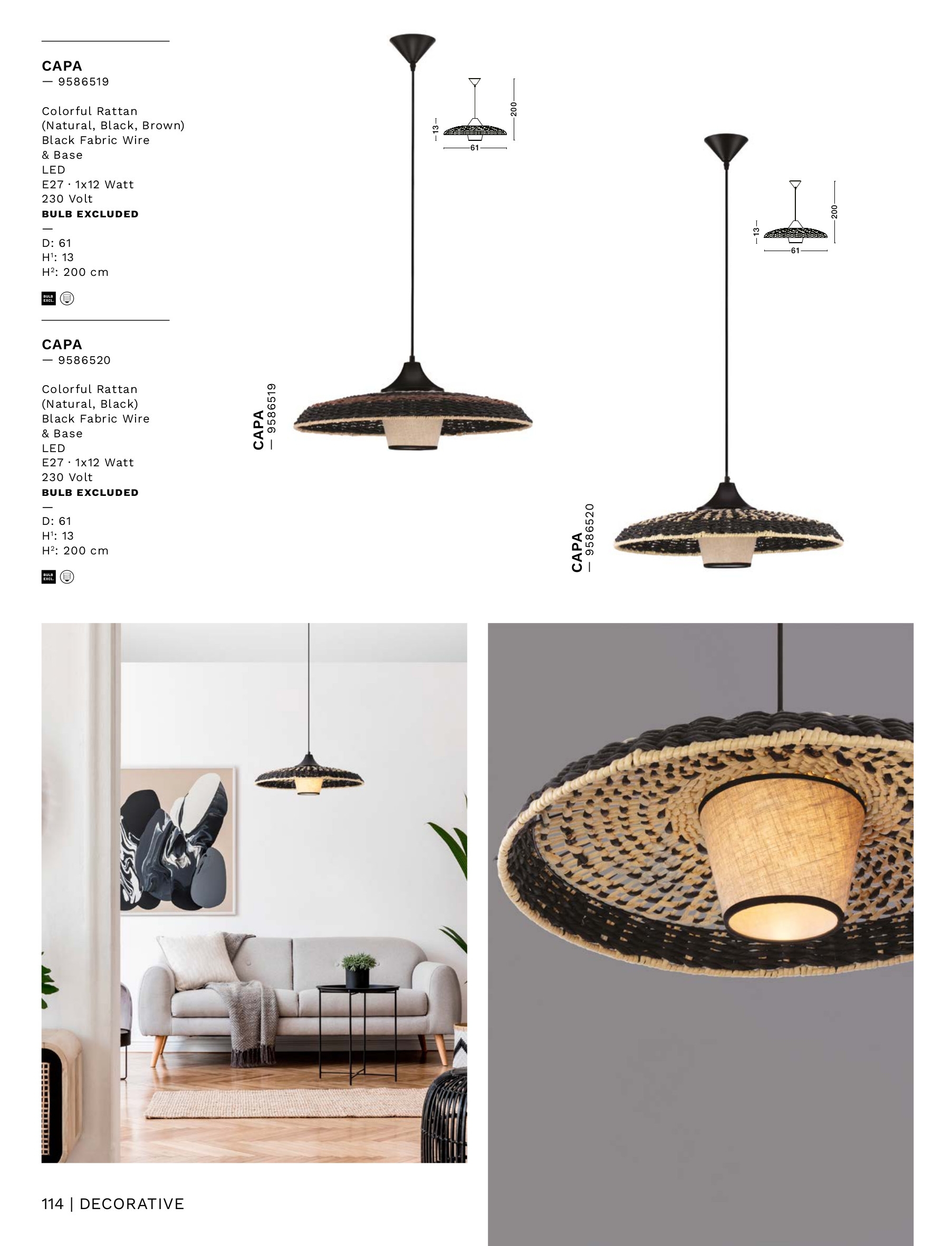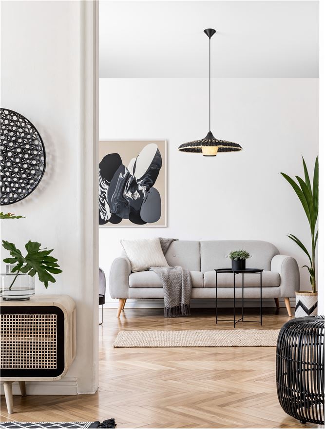 Осветителното тяло 9586520 ще осигури комфорт и естетика във всяко помещение, в което се постави. Цялостната визия и дизайн на лампата и вложените в изработката й материали, като оцветен ратан (натурален, черен и кафяв цвят), PVC кабел с черна текстилна оплетка, черен метал, ще допринесат за един неповторим стил. Благодарение на дългогодишния опит, качествените материали и строгия контрол на качеството на изработка на производителя Nova-Luce (Гърция), 9586520 е на високо европейско ниво.