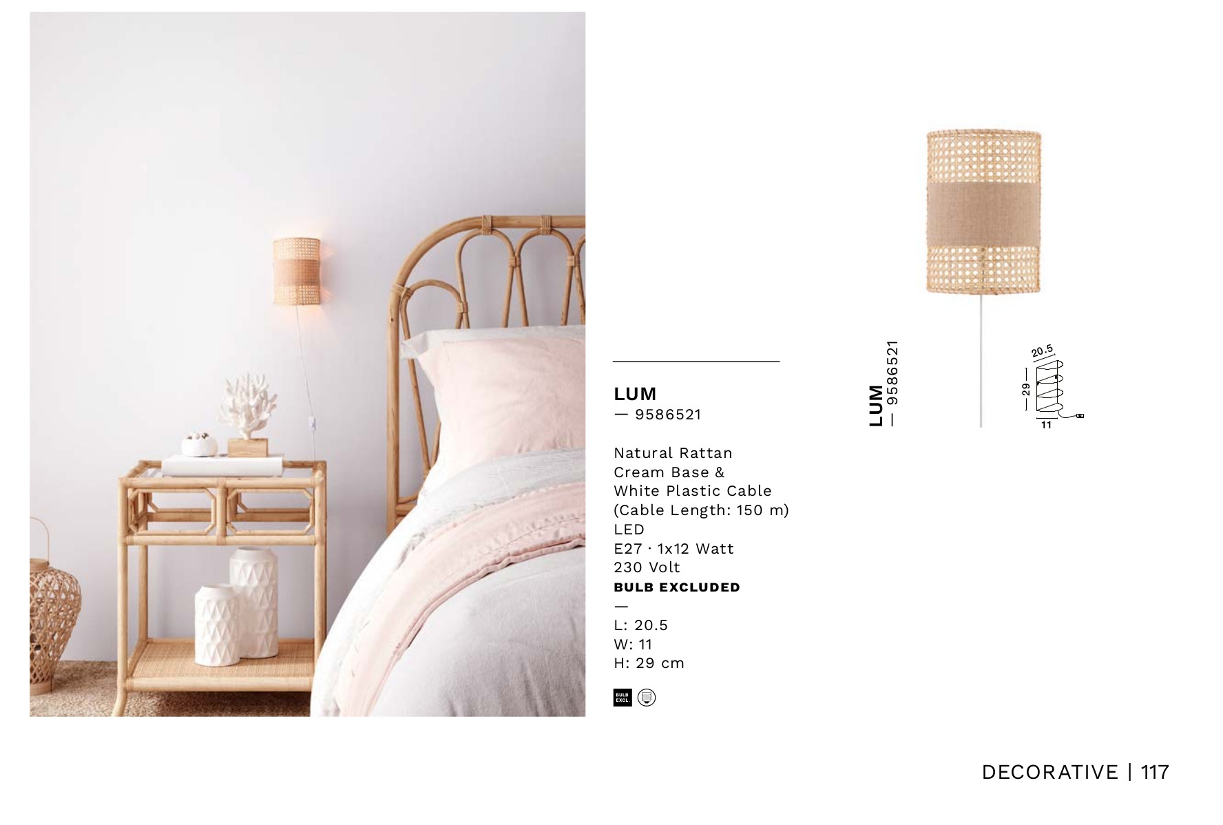 Осветителното тяло 9586521 ще осигури комфорт и естетика във всяко помещение, в което се постави. Цялостната визия и дизайн на лампата и вложените в изработката й материали, като ратан в естествен цвят, основа в цвят крем, кабел в бяло 1.5m с щепсел и ключ ON/OFF, ще допринесат за един неповторим стил. Благодарение на дългогодишния опит, качествените материали и строгия контрол на качеството на изработка на производителя Nova-Luce (Гърция), 9586521 е на високо европейско ниво.