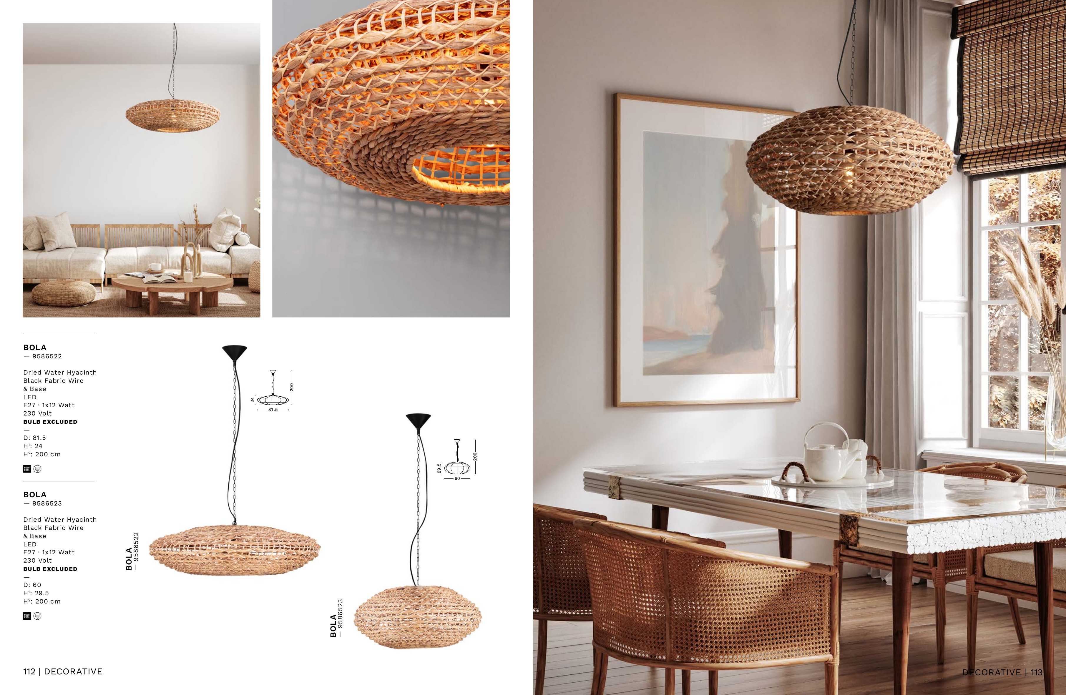 Осветителното тяло 9586523 ще осигури комфорт и естетика във всяко помещение, в което се постави. Цялостната визия и дизайн на лампата и вложените в изработката й материали, като изсушен воден зюмбюл (хиацинт), кабел с черна текстилна оплетка, метал в черно, ще допринесат за един неповторим стил. Благодарение на дългогодишния опит, качествените материали и строгия контрол на качеството на изработка на производителя Nova-Luce (Гърция), 9586523 е на високо европейско ниво.