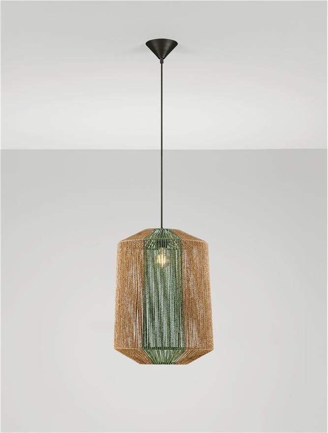 Стилът и естетиката на обстановката ще се обогатят благодарение, както на цялостната визия и дизайн на осветителното тяло, така и на вложените в изработката му, качествени материали, като: натурално и зелено въже, стомана в матово черен цвят.