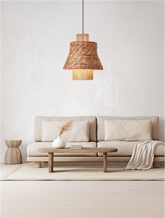 Стилът и естетиката на обстановката ще се обогатят благодарение, както на цялостната визия и дизайн на осветителното тяло, така и на вложените в изработката му, качествени материали, като: натурален воден зюмбюл, оранжево въже, основа от матово черна стомана.