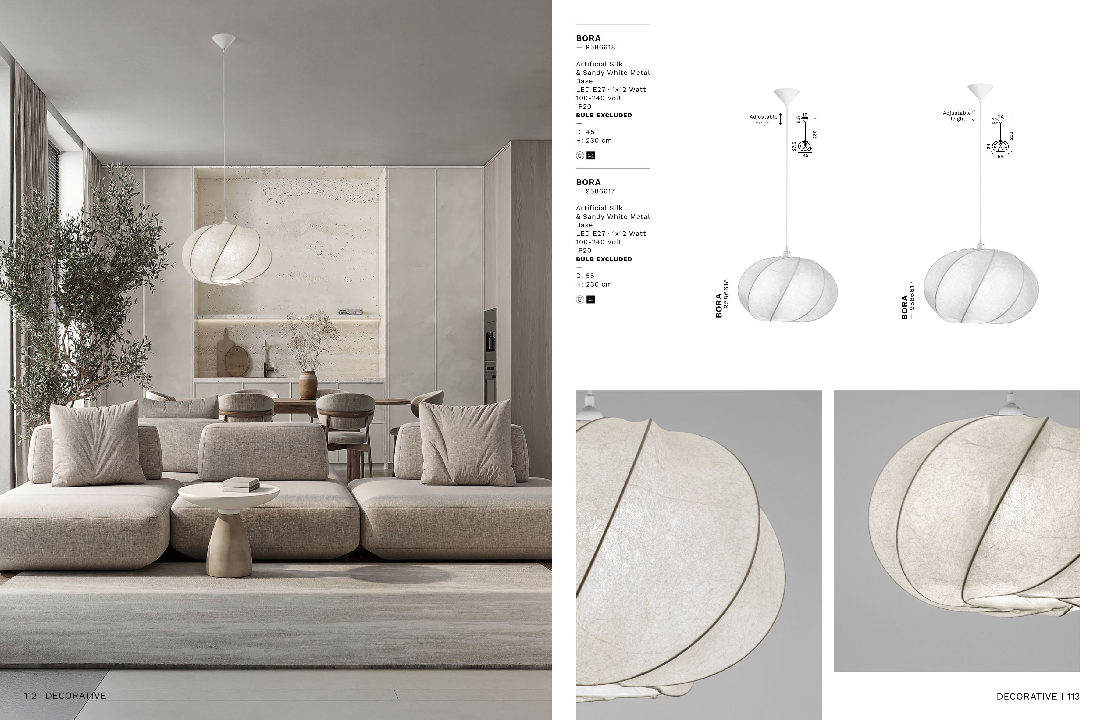 Стилът и естетиката на обстановката ще се обогатят благодарение, както на цялостната визия и дизайн на осветителното тяло, така и на вложените в изработката му, качествени материали, като: изкуствена коприна, метал в матово бял цвят.
