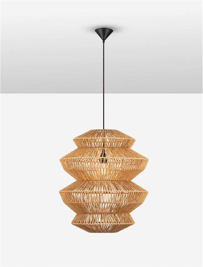 Стилът и естетиката на обстановката ще се обогатят благодарение, както на цялостната визия и дизайн на осветителното тяло, така и на вложените в изработката му, качествени материали, като: въже от естествени материали, стомана в черен цвят захранващ кабел с черна текстилна оплетка.