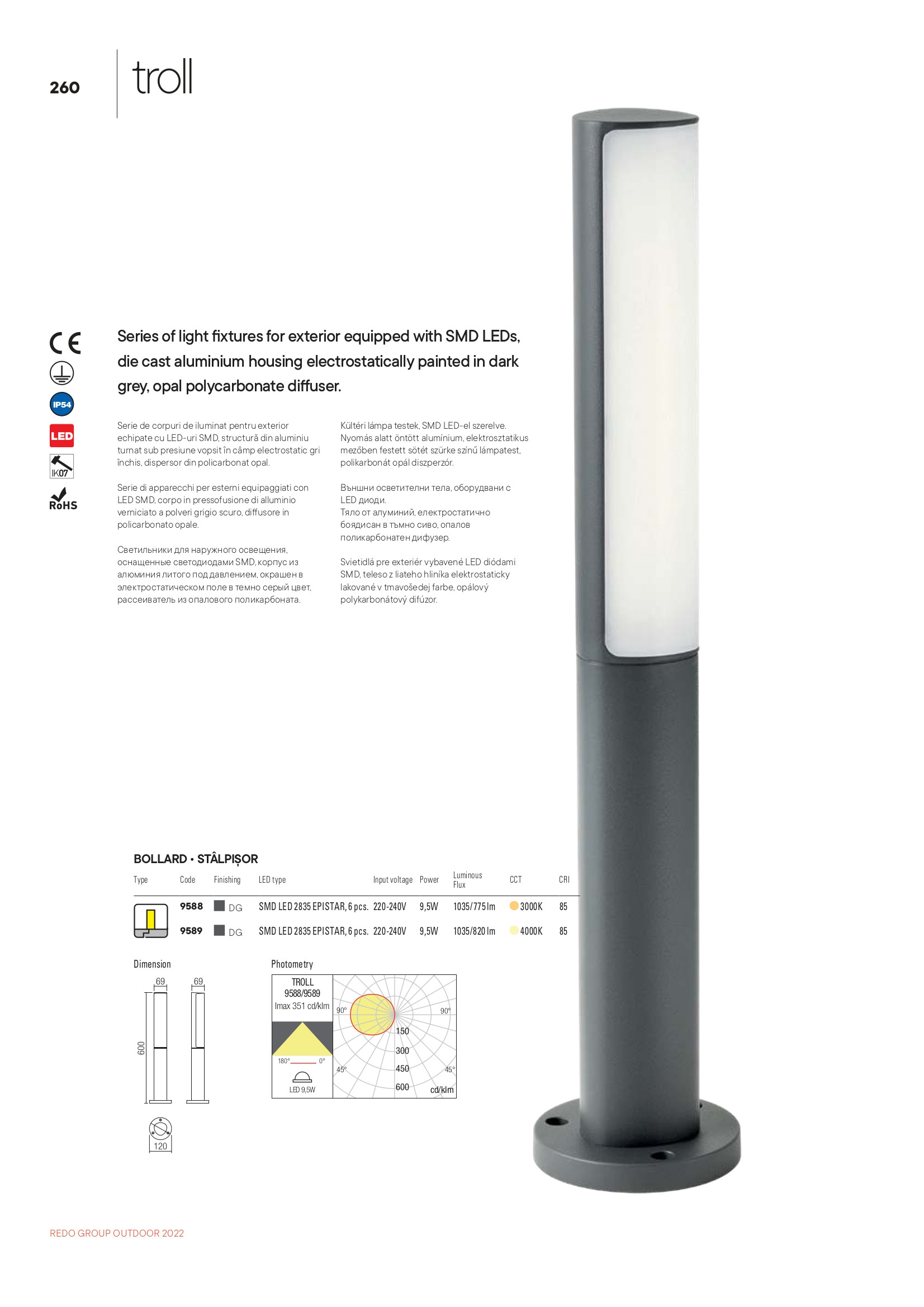 Осветителното тяло 9588 представлява външна лампа в съвременен стил. 9588 е от категорията осветителни тела и е подходящо за осветяване на различни помещения и пространства като: градинско осветление, външно осветление.
