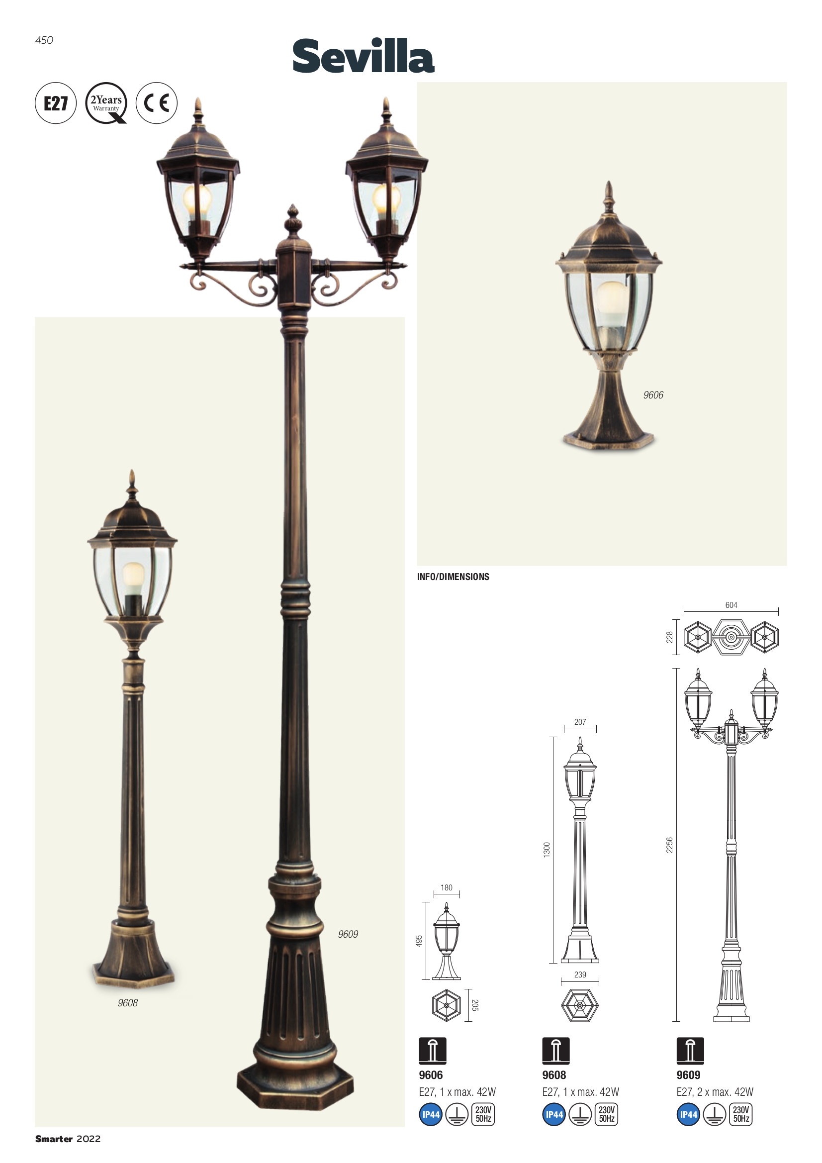 Осветителното тяло 9608 представлява външна лампа в класически стил. 9608 е от категорията осветителни тела и е подходящо за осветяване на различни помещения и пространства като: градинско осветление, външно осветление.