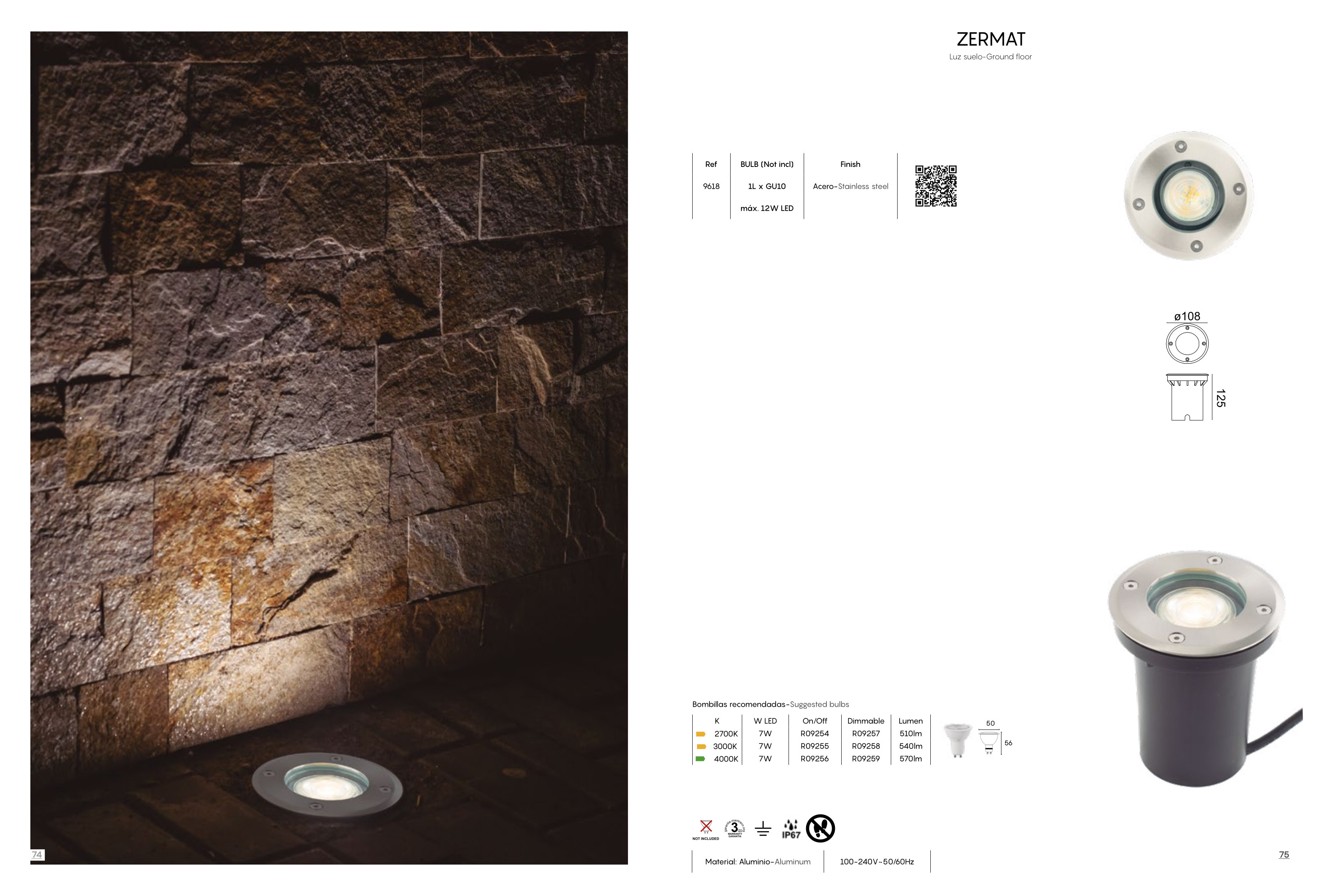 Лед външна лампа 9618 Ground Spotlight IP67 GU10 ZERMAT ще осигури комфорт и естетика във всяко помещение, в което се постави. Цялостната визия и дизайн на led лампата и вложените в изработката й материали, като алуминий с финиш стомана, полимер в черен цвят, ще допринесат за един неповторим стил. Благодарение на дългогодишния опит в производството на лед осветление, качествените материали и строгия контрол на качеството на изработка на производителя Mantra (Испания), 9618 Ground Spotlight IP67 GU10 ZERMAT е на високо европейско ниво.