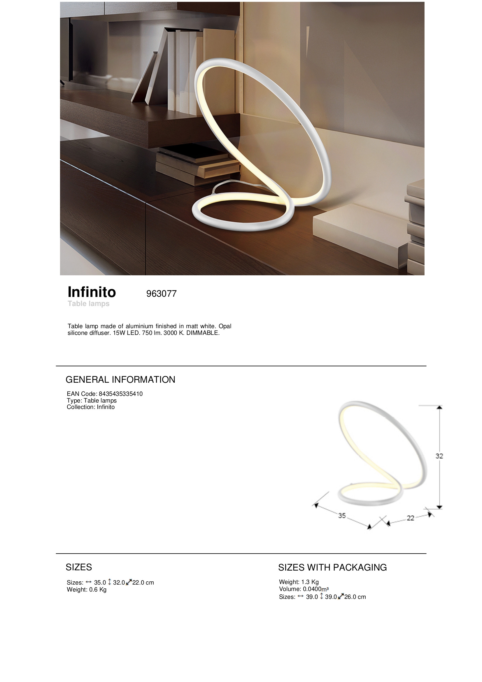 Осветителното тяло 963077 ще осигури комфорт и естетика във всяко помещение, в което се постави. Цялостната визия и дизайн на лампата и вложените в изработката й материали, като алуминий с матово бяло покритие, дифузьор от опалово бял силикон, ще допринесат за един неповторим стил. Благодарение на дългогодишния опит, качествените материали и строгия контрол на качеството на изработка на производителя Schuller (Испания), 963077 е на високо европейско ниво.