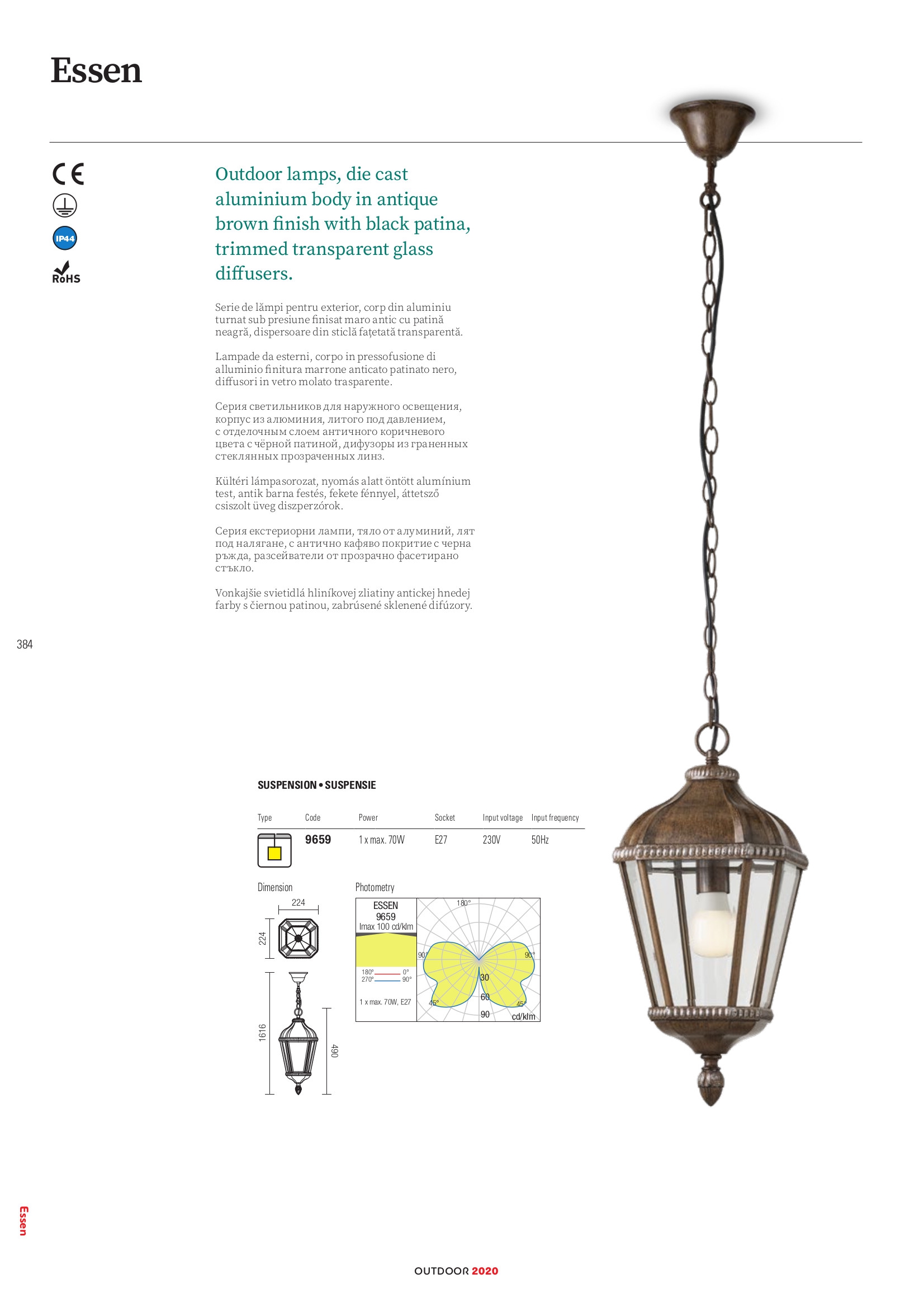 Осветителното тяло 9660 ESSEN ST H61 1X70W E27 IP44 ще осигури комфорт и естетика във всяко помещение, в което се постави. Цялостната визия и дизайн на лампата и вложените в изработката й материали, като алуминий с антично кафяво покритие с имитация на черна ръжда, разсейвател от прозрачно фасетирано стъкло, ще допринесат за един неповторим стил. Благодарение на дългогодишния опит, качествените материали и строгия контрол на качеството на изработка на дизайнерската линия Redo Outdoor на производителя Redo (Румъния), 9660 ESSEN ST H61 1X70W E27 IP44 е на високо европейско ниво.