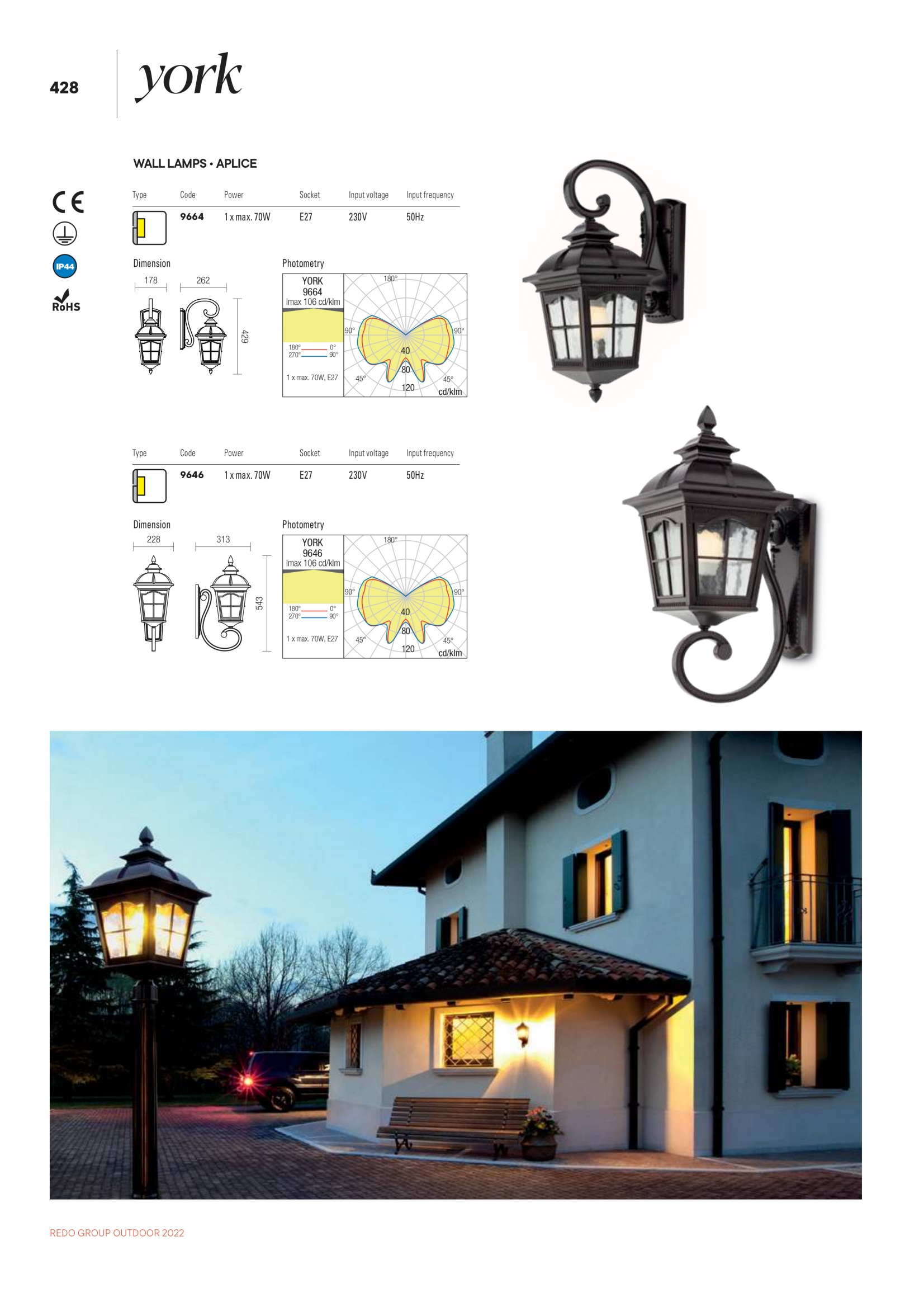 Осветителното тяло 9664 YORK AP JOS 1X70W E27 IP44 MICA ще осигури комфорт и естетика във всяко помещение, в което се постави. Цялостната визия и дизайн на лампата и вложените в изработката й материали, като алуминий отлят под налягане в цвят антично черно с кафява ръжда, разсейватели на светлината от декоративно стъкло тип "Waterglass", ще допринесат за един неповторим стил. Благодарение на дългогодишния опит, качествените материали и строгия контрол на качеството на изработка на дизайнерската линия Redo Outdoor на производителя Redo (Румъния), 9664 YORK AP JOS 1X70W E27 IP44 MICA е на високо европейско ниво.