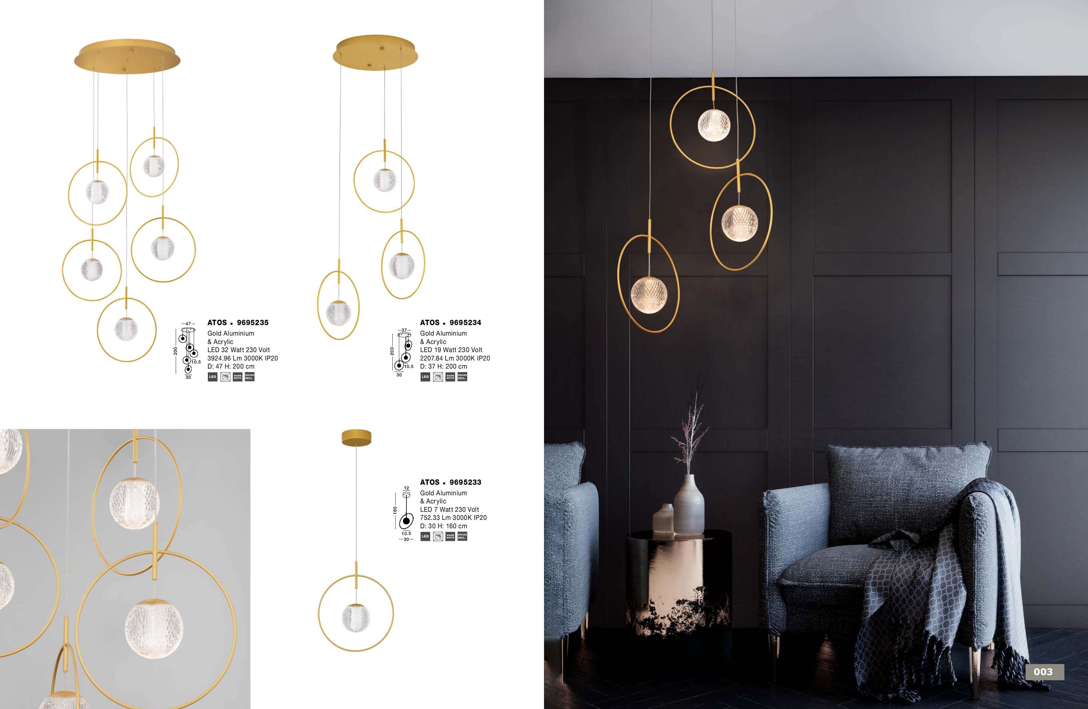 Осветителното тяло 9695233 ще осигури комфорт и естетика във всяко помещение, в което се постави. Цялостната визия и дизайн на лампата и вложените в изработката й материали, като алуминий в цвят злато, сериграфиран акрил, ще допринесат за един неповторим стил. Благодарение на дългогодишния опит, качествените материали и строгия контрол на качеството на изработка на производителя Nova-Luce (Гърция), 9695233 е на високо европейско ниво.