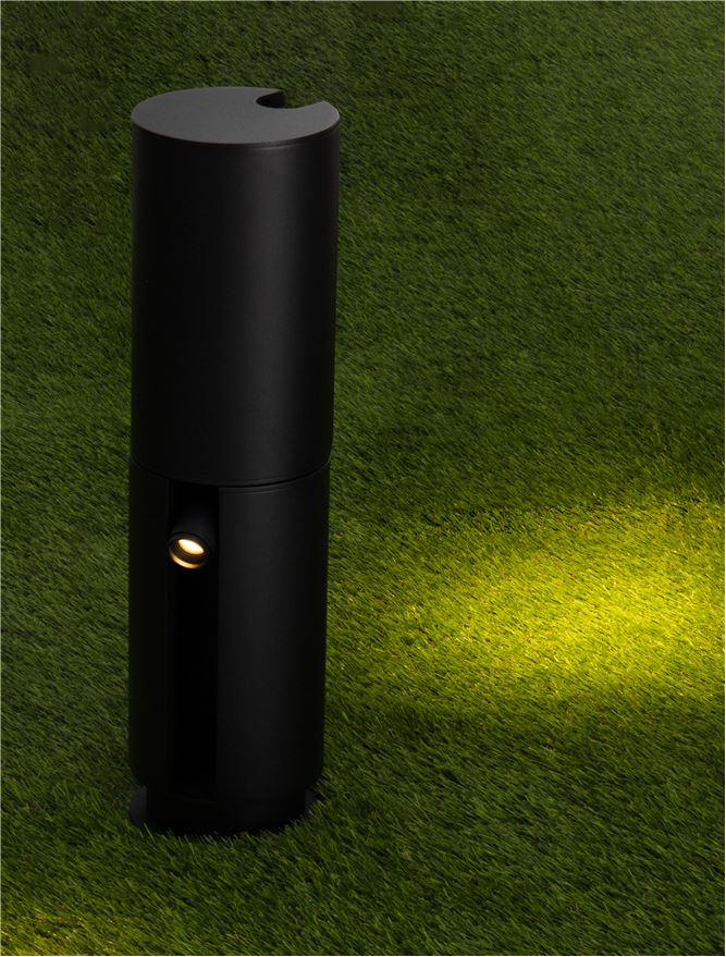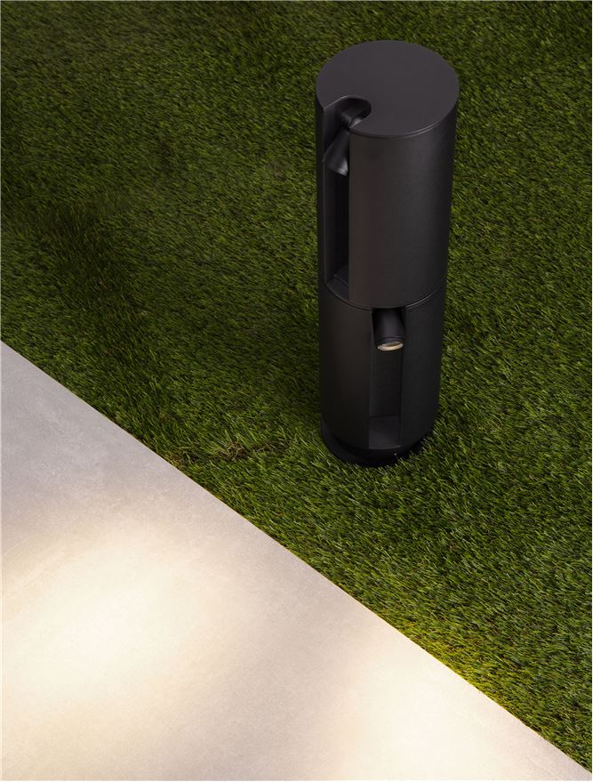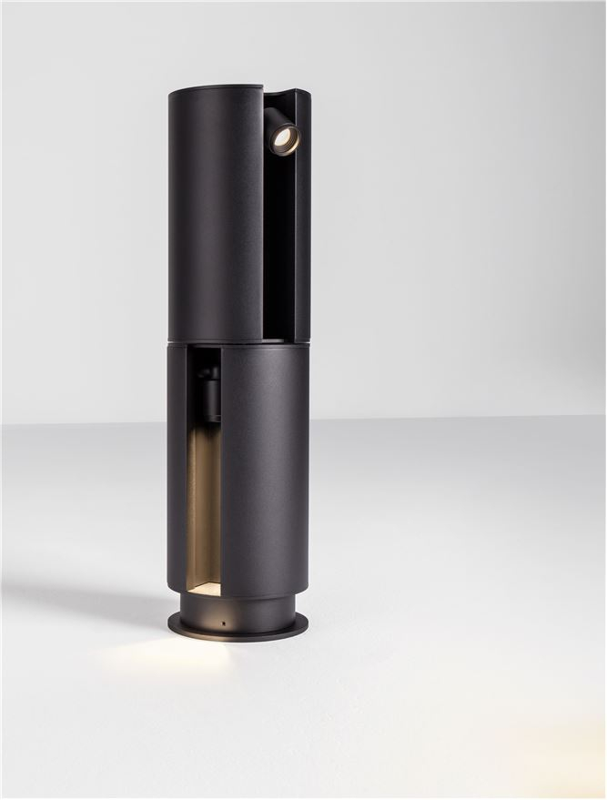 алуминий в матово черен цвят, защитено против корозия причинена от сол, осветителното тяло може да се върти, а лъча да се насочва, два източника на светлина
