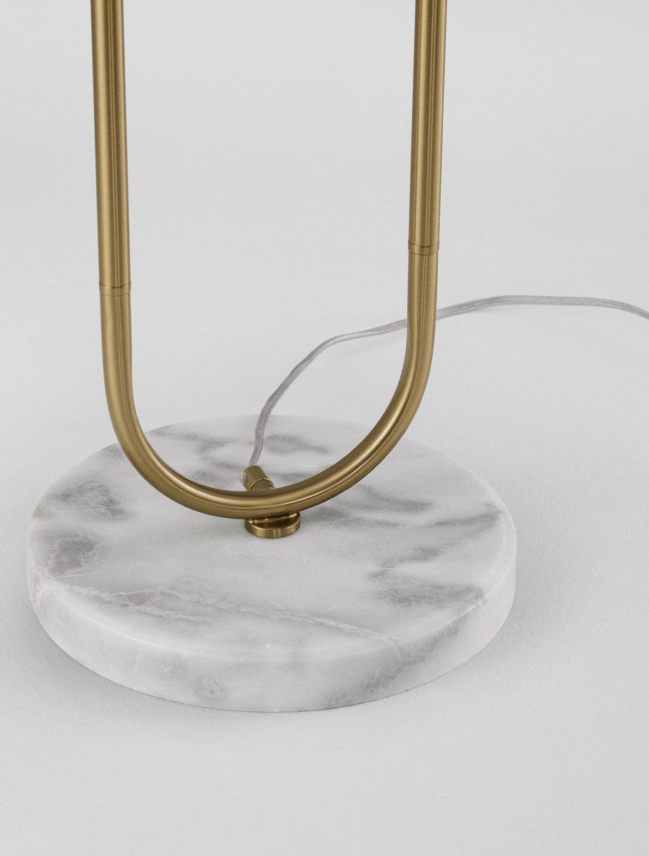 стомана в цвят златен месинг, основа от бял мрамор, абажур от бял текстил, дължина на кабела 220см