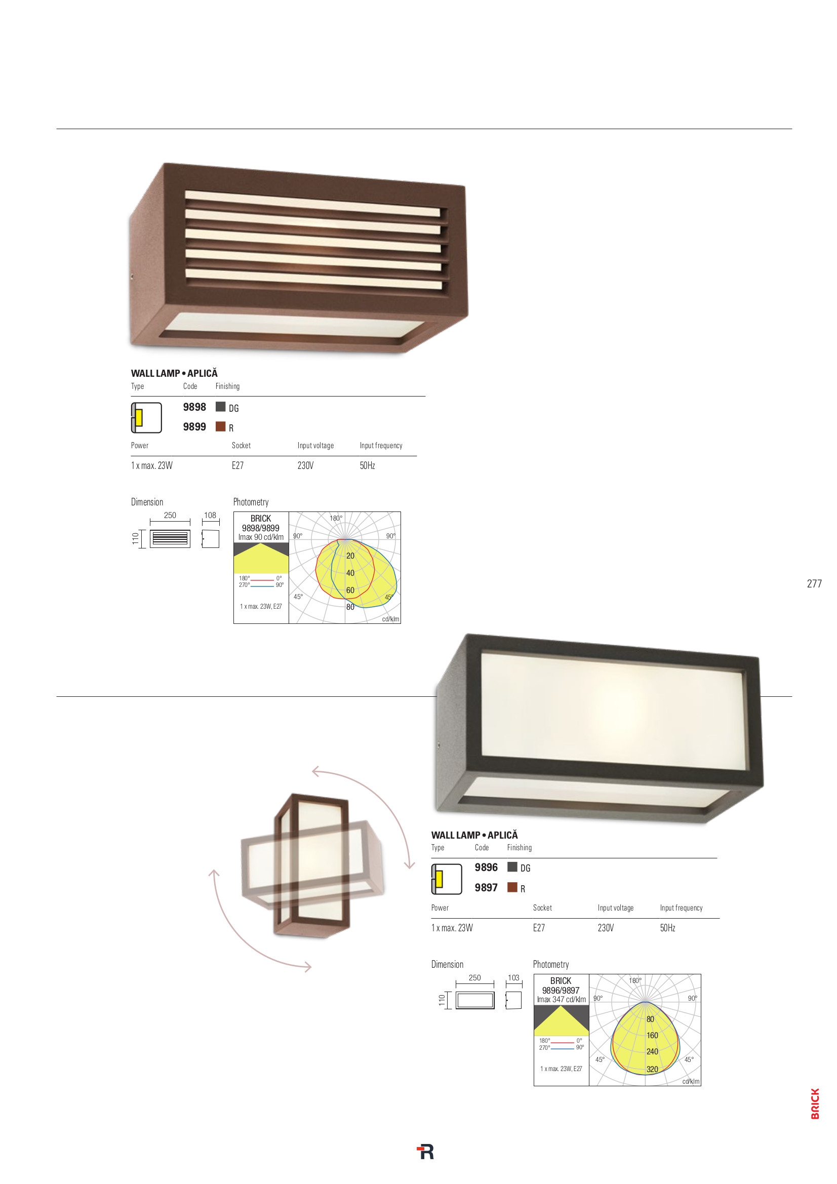Осветителното тяло 9899 BRICK AP/PL 1X23W E27 IP54 R decor представлява аплик, външна лампа в съвременен стил. 9899 BRICK AP/PL 1X23W E27 IP54 R decor е от категорията осветителни тела и е подходящо за осветяване на различни помещения и пространства като: външно осветление, фасадно осветление.