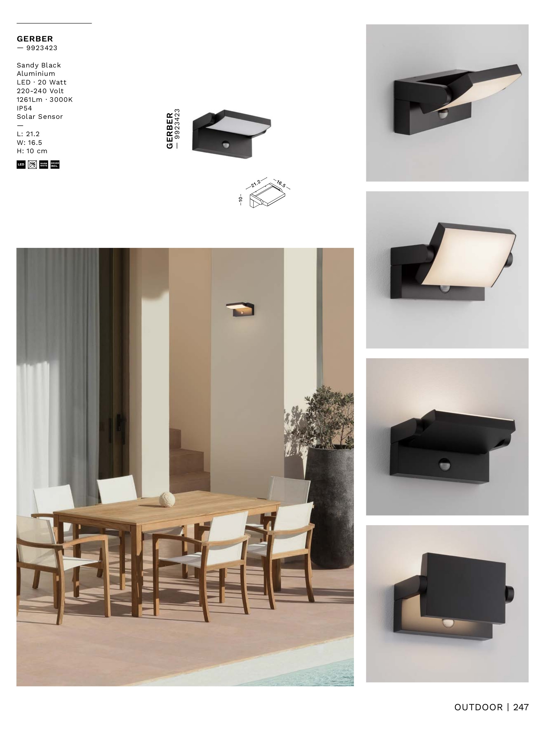 Осветителното тяло 9923423 ще осигури комфорт и естетика във всяко помещение, в което се постави. Цялостната визия и дизайн на лампата и вложените в изработката й материали, като отлят под налягане алуминий в пясъчно черен цвят, сензор за светлина, източникът на светлина може да се завърта около оста си, ще допринесат за един неповторим стил. Благодарение на дългогодишния опит, качествените материали и строгия контрол на качеството на изработка на производителя Nova-Luce (Гърция), 9923423 е на високо европейско ниво.