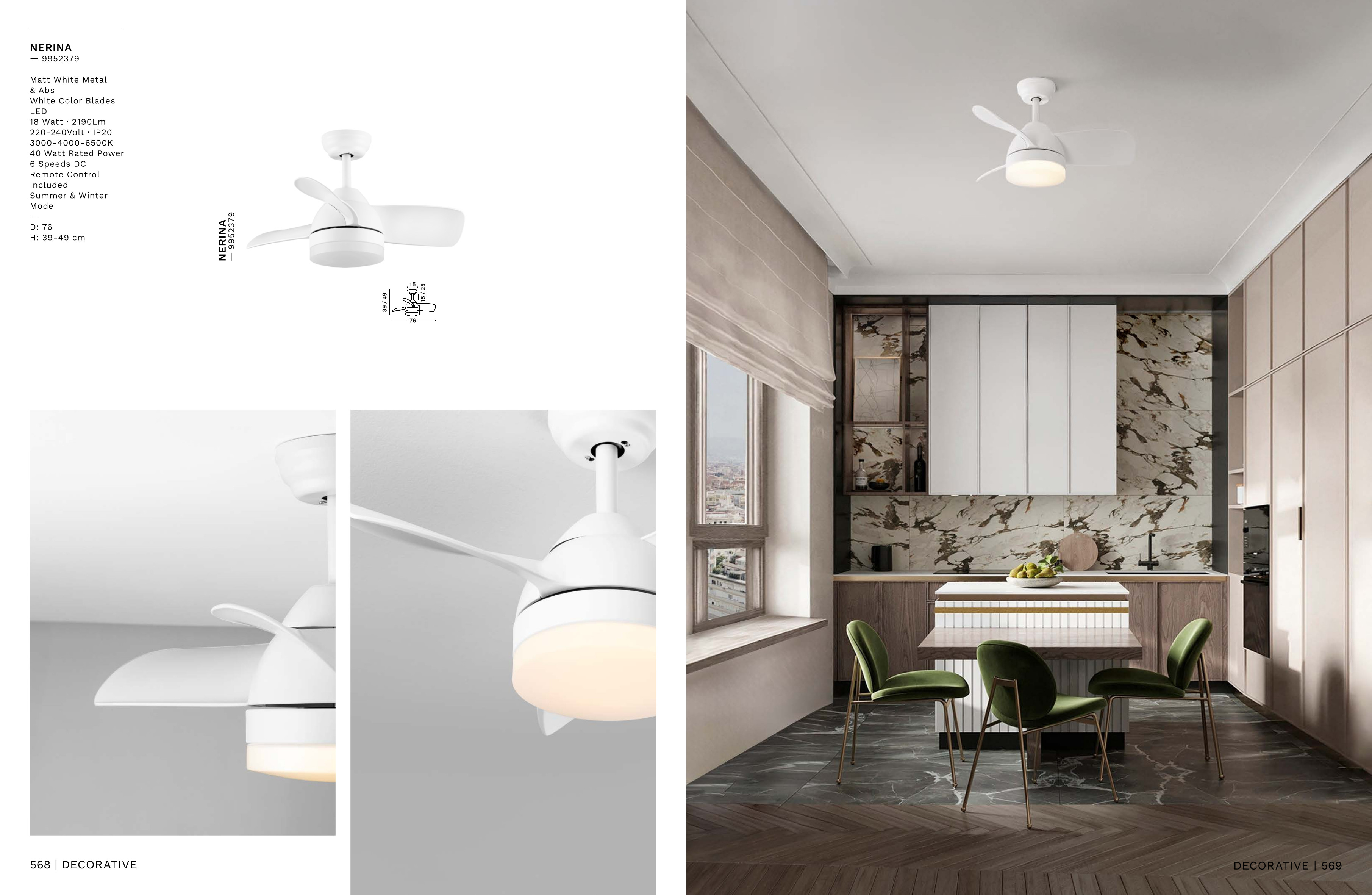 Осветителното тяло 9952379 ще осигури комфорт и естетика във всяко помещение, в което се постави. Цялостната визия и дизайн на лампата и вложените в изработката й материали, като метал в цвят бял мат, полимер в бяло, (ABS), ССТ 3000-4000-6500K, 40W DC двигател с 6 скорости, зимен и летен режим на работа, дистанционно включено в комплекта, ще допринесат за един неповторим стил. Благодарение на дългогодишния опит, качествените материали и строгия контрол на качеството на изработка на производителя Nova-Luce (Гърция), 9952379 е на високо европейско ниво.