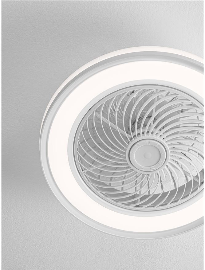 полимер (ABS) в матово бяло, перки от MDF в бяло, DC мотор 20W с 6 скорости, <50 dB, ССТ 3000-4000-6500K, димиране, контрол на вентилатора и смяна на цветната температура се извършва с дистанционно, включено в компекта