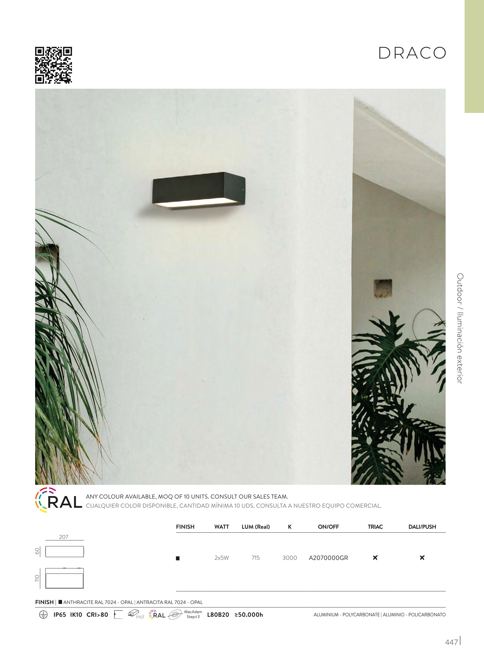 Осветителното тяло A2070000GR (Wall lamp) ще осигури комфорт и естетика във всяко помещение, в което се постави. Цялостната визия и дизайн на лампата и вложените в изработката й материали, като алуминий в цвят антрацит, поликарбонат в опалово бял цвят, ще допринесат за един неповторим стил. Благодарение на дългогодишния опит, качествените материали и строгия контрол на качеството на изработка на производителя ACB (Испания), A2070000GR (Wall lamp) е на високо европейско ниво.
