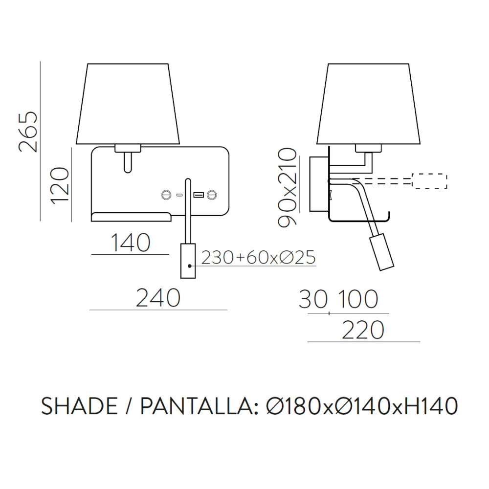 метал в тукстурирано бяло, абажур от черен текстил, портове USB A и С, превключватели ON/OFF, поставка за смартфон отляво