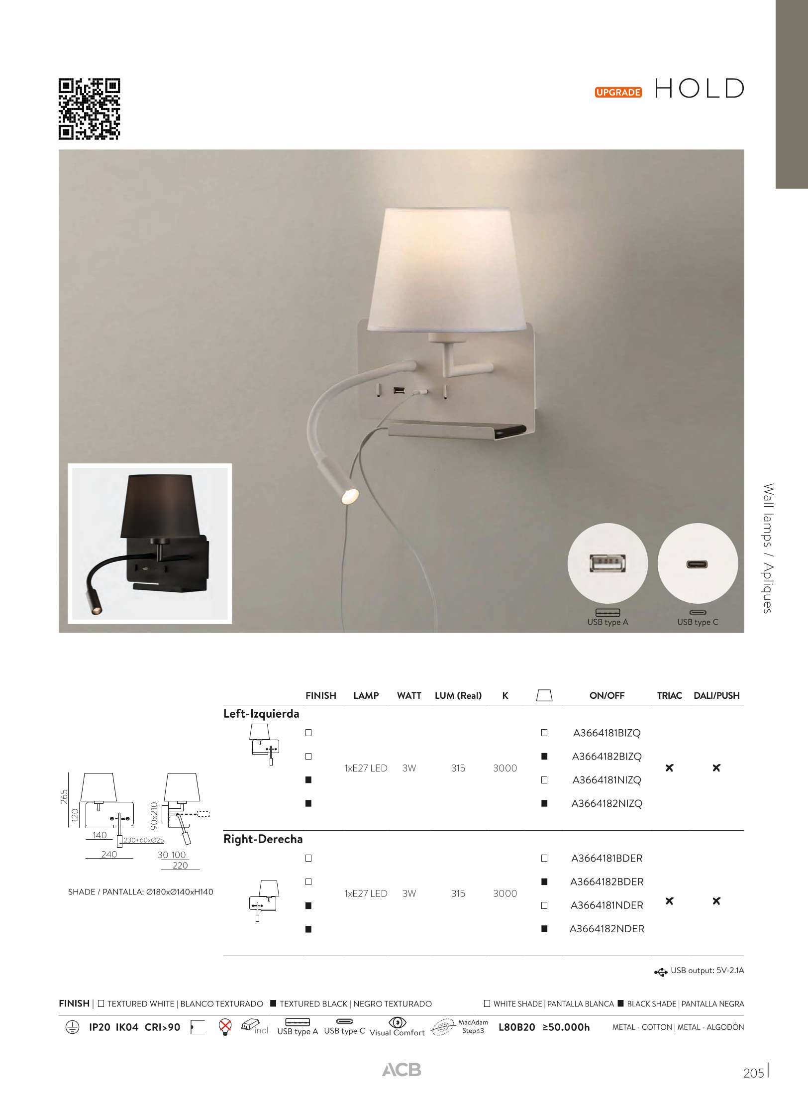Лед аплик A3664182BIZQ ще осигури комфорт и естетика във всяко помещение, в което се постави. Цялостната визия и дизайн на led лампата и вложените в изработката й материали, като метал в тукстурирано бяло, абажур от черен текстил, портове USB A и С, превключватели ON/OFF, поставка за смартфон отляво, ще допринесат за един неповторим стил. Благодарение на дългогодишния опит в производството на лед осветление, качествените материали и строгия контрол на качеството на изработка на производителя ACB (Испания), A3664182BIZQ е на високо европейско ниво.