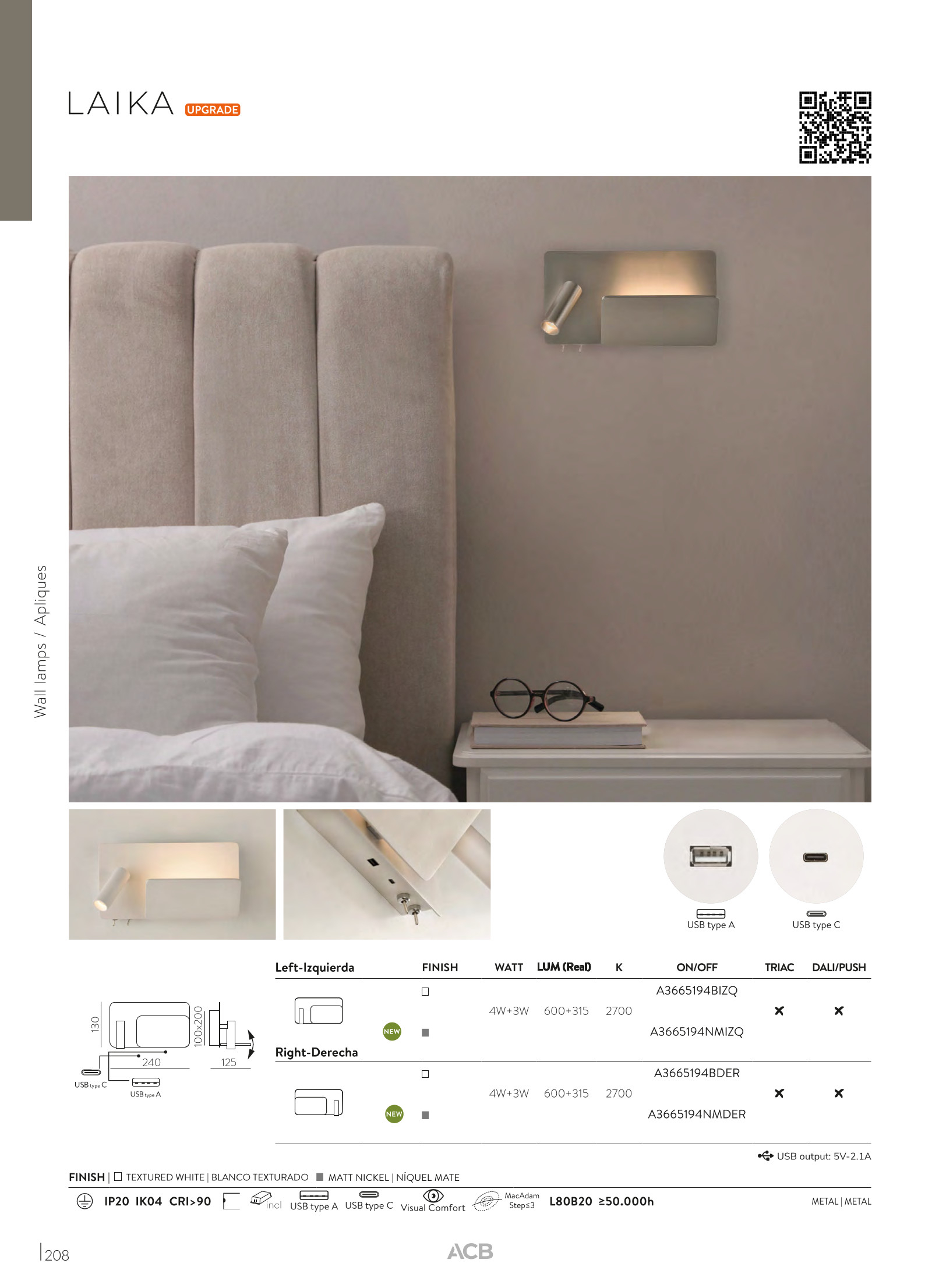 Лед аплик A3665194NMDER ще осигури комфорт и естетика във всяко помещение, в което се постави. Цялостната визия и дизайн на led лампата и вложените в изработката й материали, като метал в цвят матов никел, портове USB A и C, превключватели ON/OFF, накланяща се поставка за смартфон отляво, ще допринесат за един неповторим стил. Благодарение на дългогодишния опит в производството на лед осветление, качествените материали и строгия контрол на качеството на изработка на производителя ACB (Испания), A3665194NMDER е на високо европейско ниво.