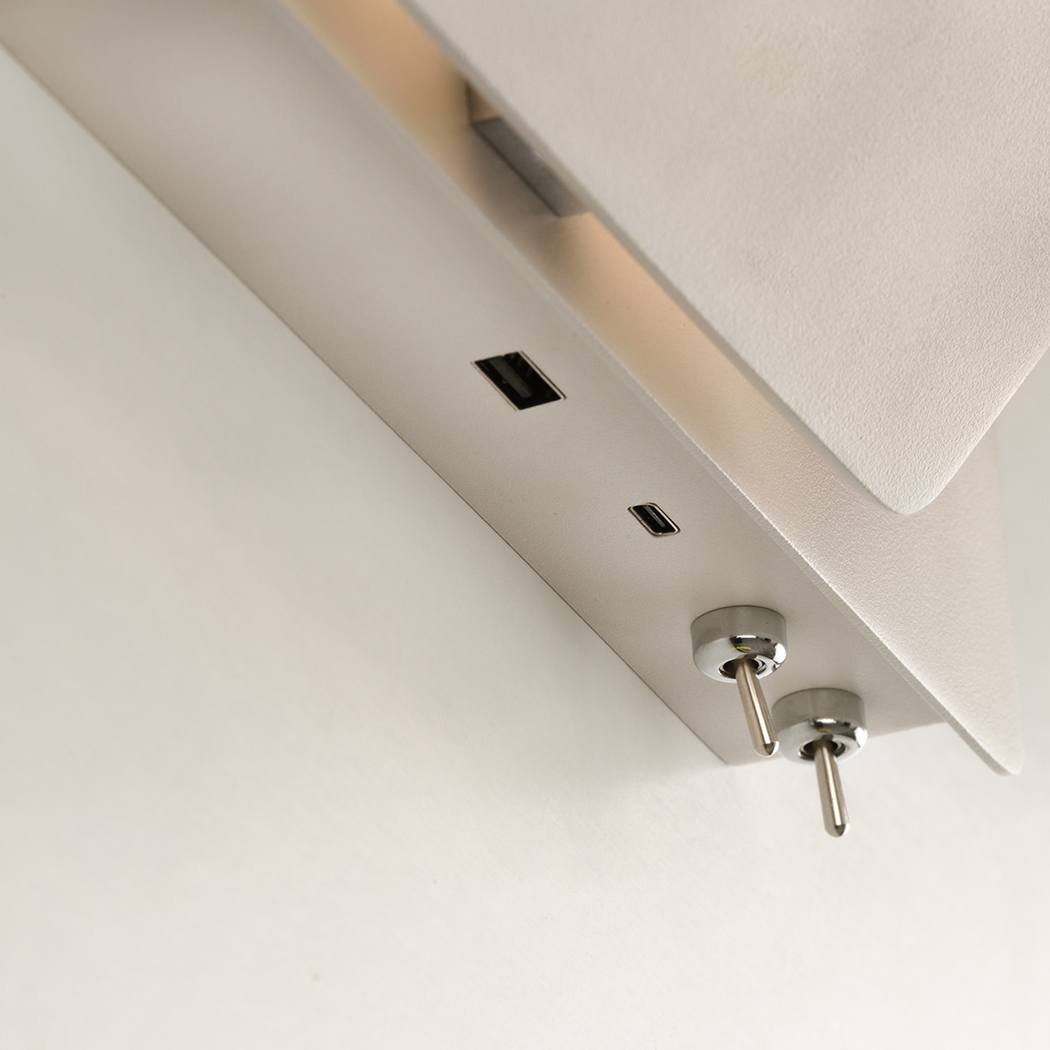 метал в цвят матов никел, портове USB A и C, превключватели ON/OFF, накланяща се поставка за смартфон отляво