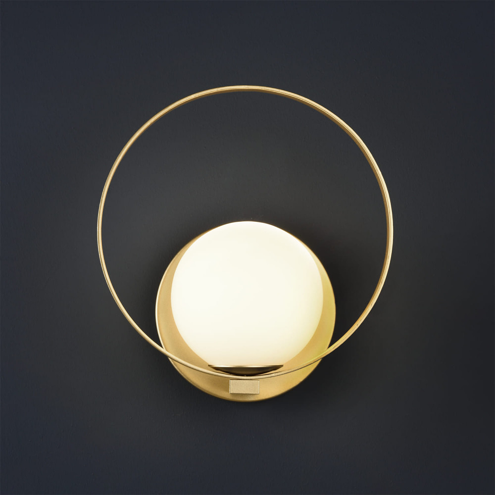 метал в цвят матово злато, двуслойно стъкло в цвят бял опал, 2700/3000К чрез плъзгащ ключ