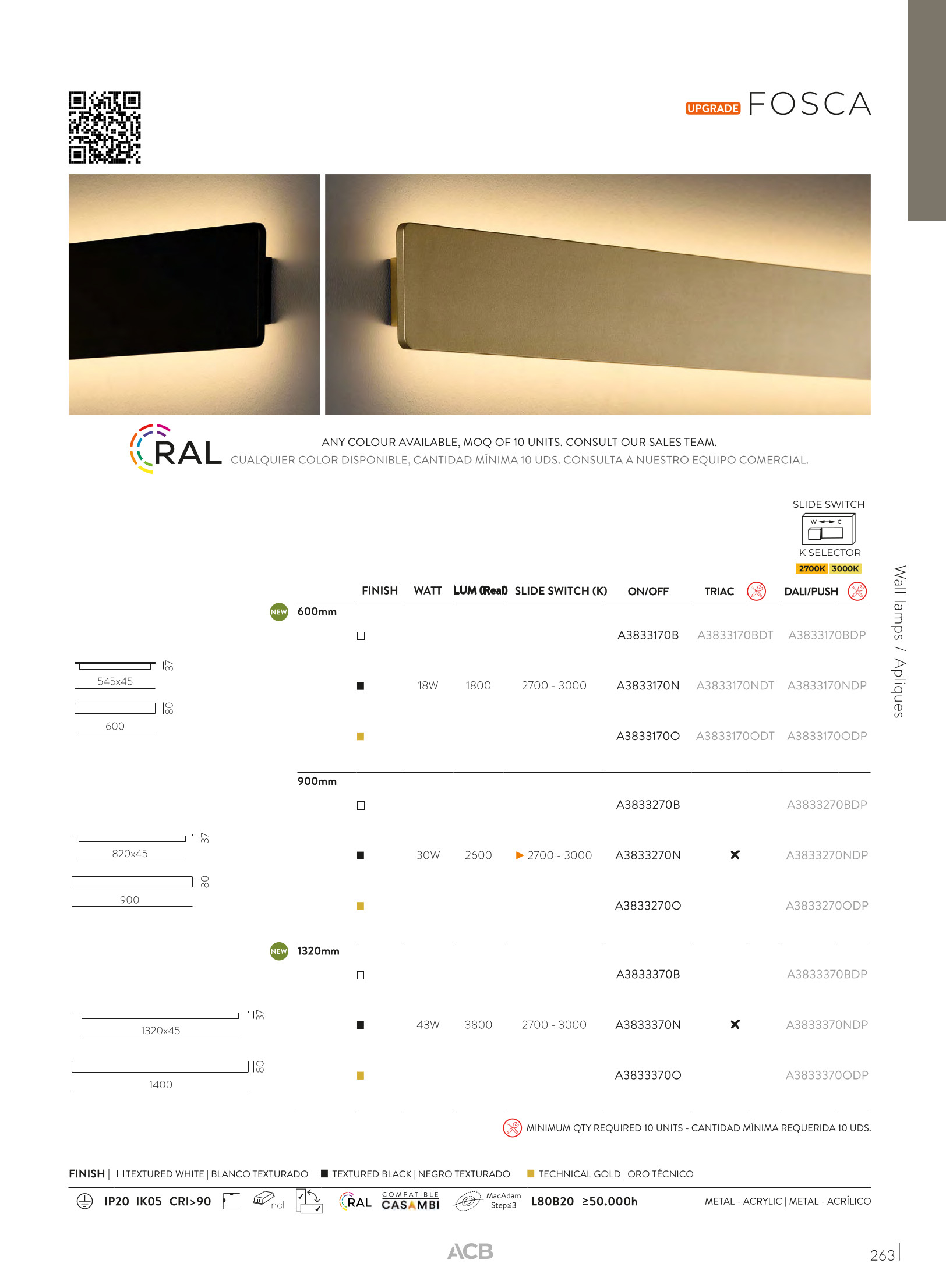 метал в цвят техническо злато, акрил в бяло, възможност за смяна на цветната температура ССТ 2700/3000К с плъзгач