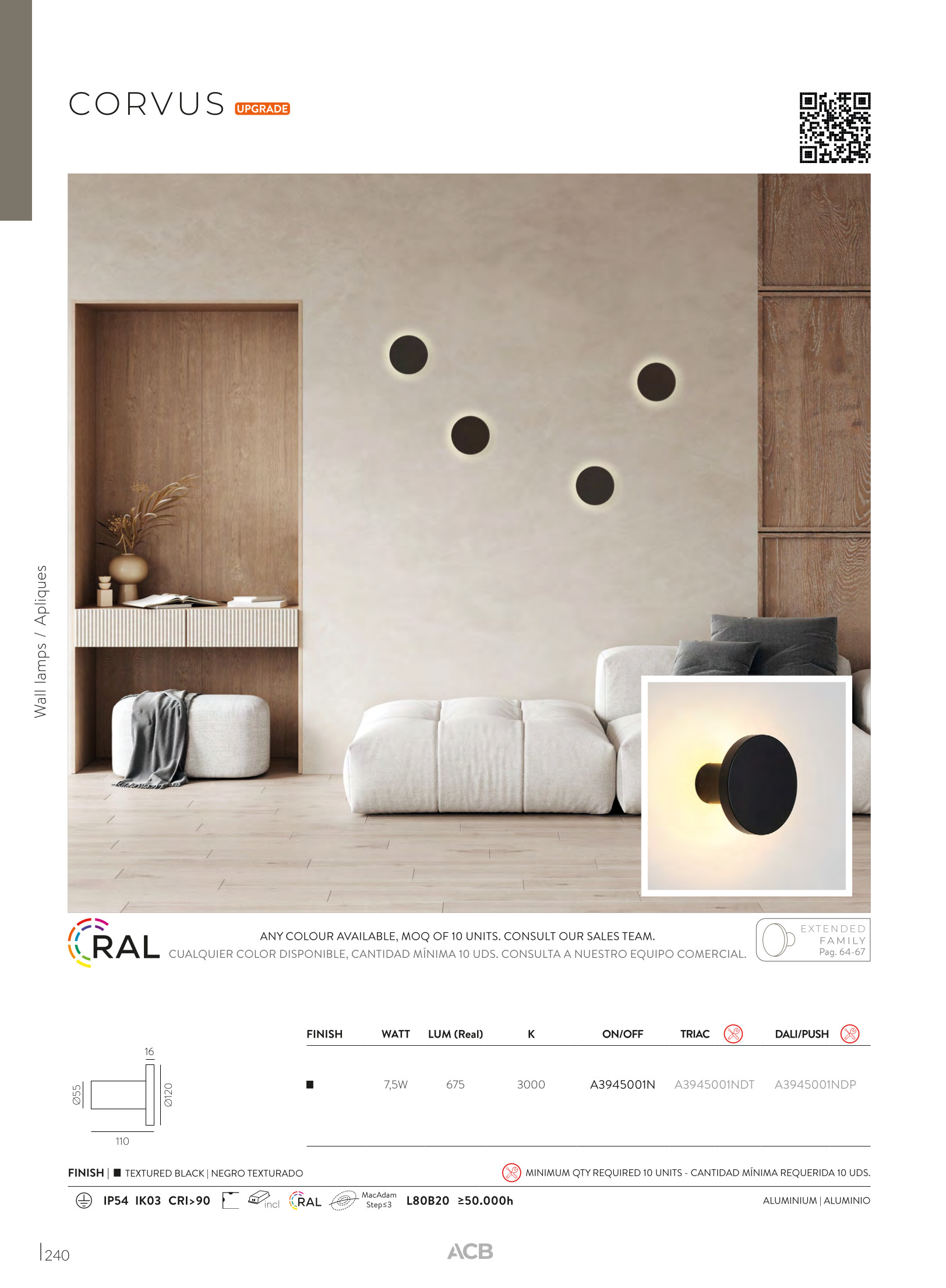 Лед аплик, външна лампа A3945001N (Wall lamp) ще осигури комфорт и естетика във всяко помещение, в което се постави. Цялостната визия и дизайн на led лампата и вложените в изработката й материали, като алуминий в текстурирано черно, полимер в опалово бял цвят, ще допринесат за един неповторим стил. Благодарение на дългогодишния опит в производството на лед осветление, качествените материали и строгия контрол на качеството на изработка на производителя ACB (Испания), A3945001N (Wall lamp) е на високо европейско ниво.