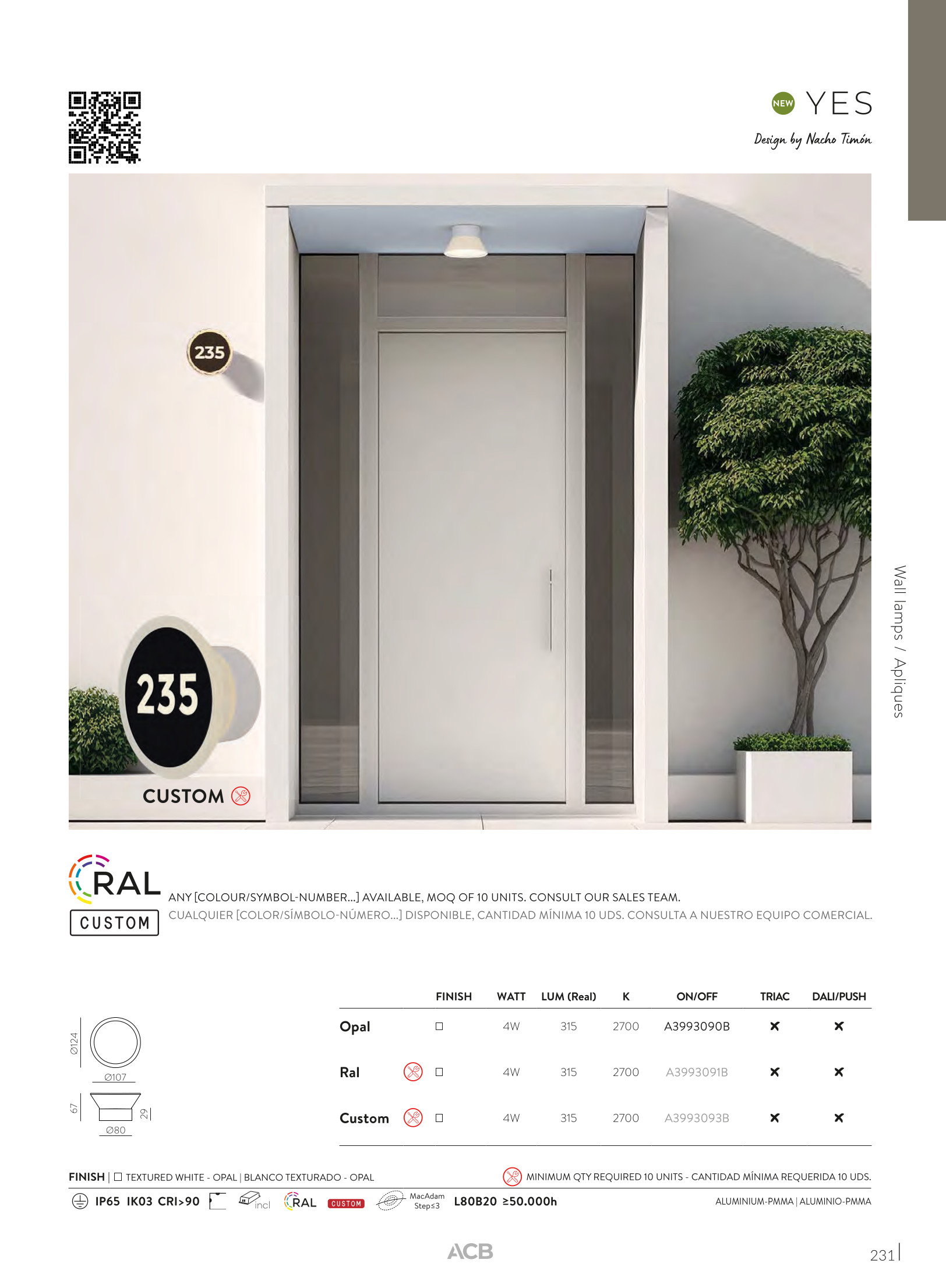 Лед аплик, външна лампа, луничка / луна A3993090B ще осигури комфорт и естетика във всяко помещение, в което се постави. Цялостната визия и дизайн на led лампата и вложените в изработката й материали, като алуминий в текстурирано бяло, полимер (РММА), опция за изписване на символ, номер и или цвят по RAL по заявка, при минимум 10 артикула от вид, ще допринесат за един неповторим стил. Благодарение на дългогодишния опит в производството на лед осветление, качествените материали и строгия контрол на качеството на изработка на производителя ACB (Испания), A3993090B е на високо европейско ниво.