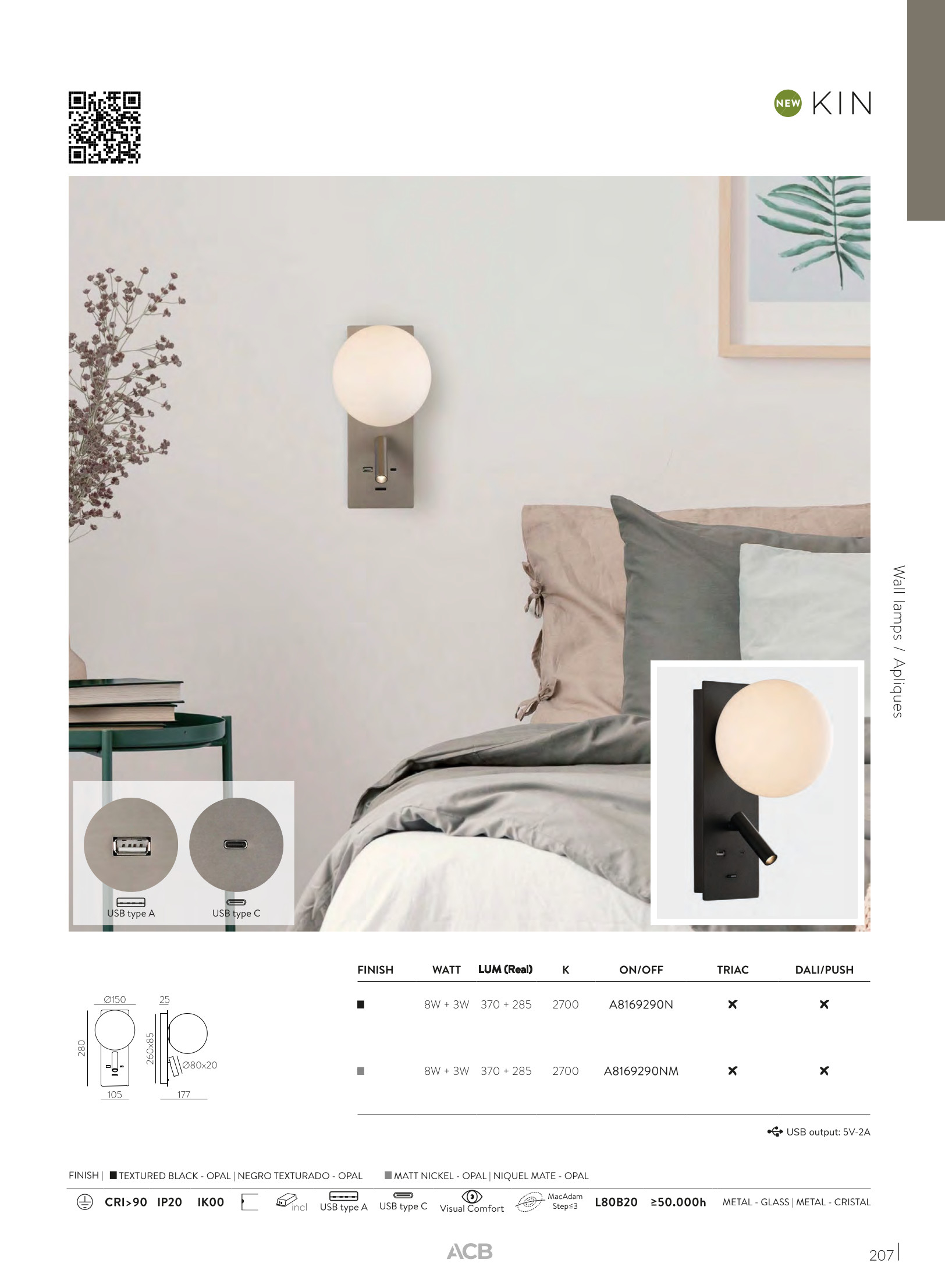 Лед аплик A8169290NM ще осигури комфорт и естетика във всяко помещение, в което се постави. Цялостната визия и дизайн на led лампата и вложените в изработката й материали, като метал в цвят матов никел, стъкло в цвят бял опал, портове USB A и C, превключвател ON/OFF, ще допринесат за един неповторим стил. Благодарение на дългогодишния опит в производството на лед осветление, качествените материали и строгия контрол на качеството на изработка на производителя ACB (Испания), A8169290NM е на високо европейско ниво.