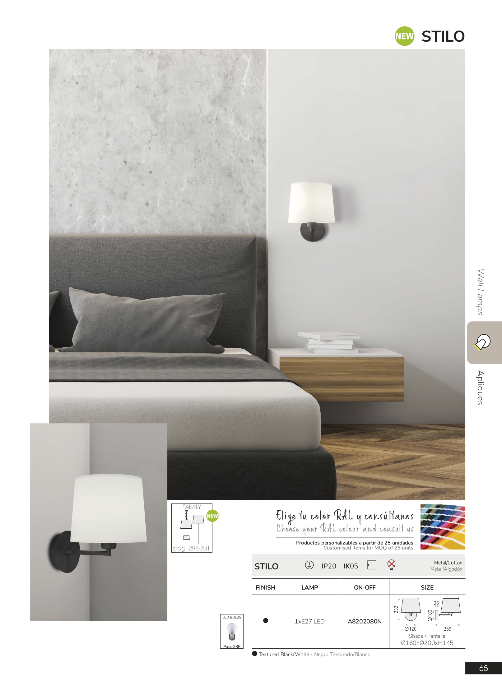 Осветителното тяло A8202080N (Wall lamp) ще осигури комфорт и естетика във всяко помещение, в което се постави. Цялостната визия и дизайн на лампата и вложените в изработката й материали, като метал в цвят текстурирано черно, абажур от текстил в бял цвят, ще допринесат за един неповторим стил. Благодарение на дългогодишния опит, качествените материали и строгия контрол на качеството на изработка на производителя ACB (Испания), A8202080N (Wall lamp) е на високо европейско ниво.
