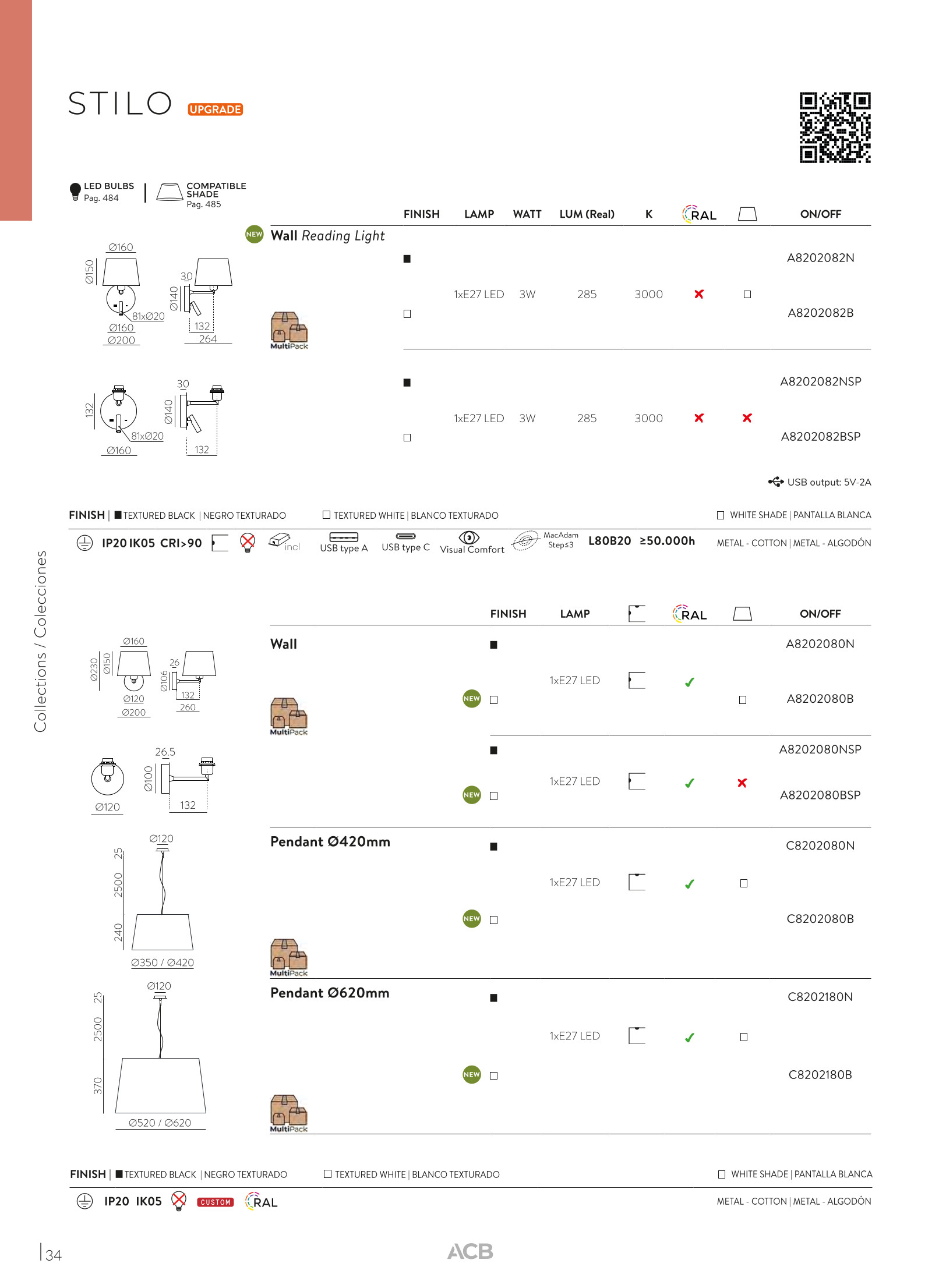 Лед аплик A8202082N ще осигури комфорт и естетика във всяко помещение, в което се постави. Цялостната визия и дизайн на led лампата и вложените в изработката й материали, като метал в текстурирано черен цвят, текстил в бял цвят, USB тип С и тип A и превключвател ON/OFF интегрирани в тялото, ще допринесат за един неповторим стил. Благодарение на дългогодишния опит в производството на лед осветление, качествените материали и строгия контрол на качеството на изработка на производителя ACB (Испания), A8202082N е на високо европейско ниво.