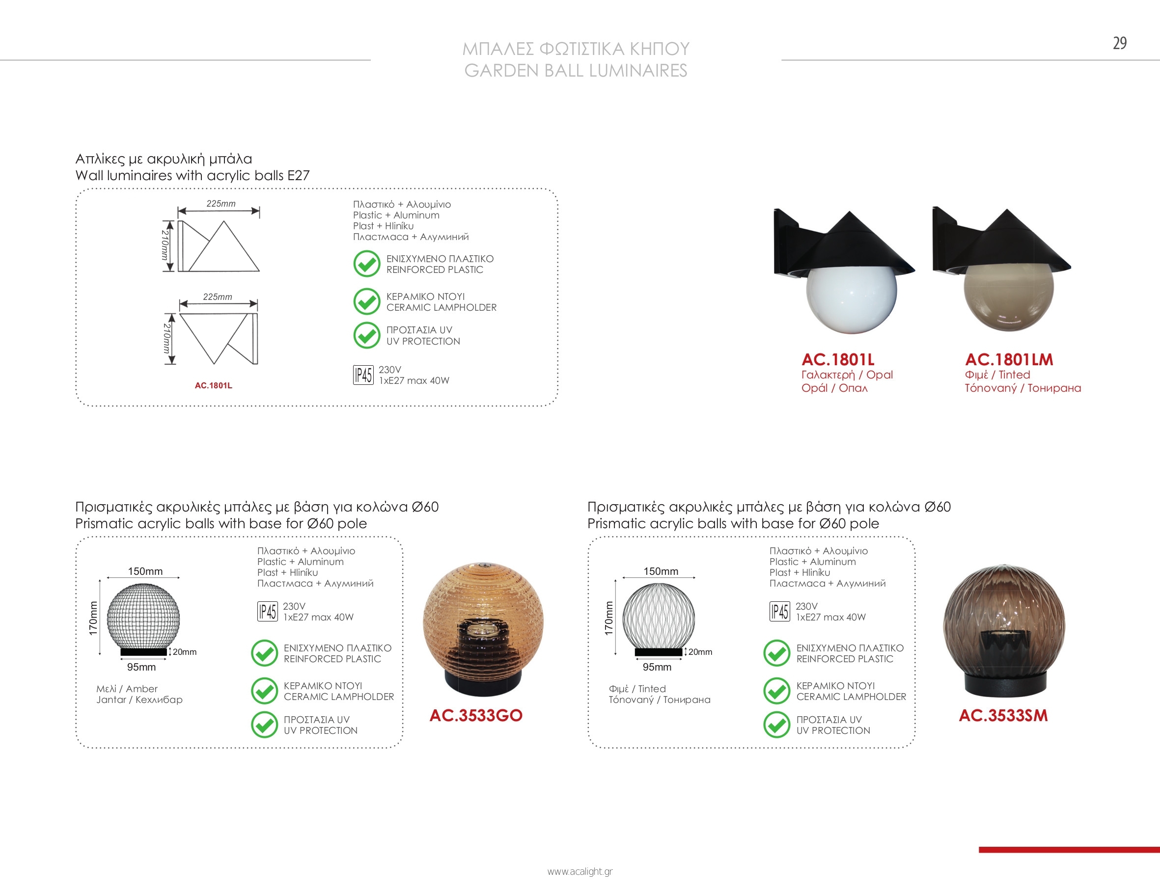Осветителното тяло AC.3533GO ще осигури комфорт и естетика във всяко помещение, в което се постави. Цялостната визия и дизайн на лампата и вложените в изработката й материали, като алуминий в черен цвят, подсилен тониран релефен полимер с UV защита, керамична фасунга, ще допринесат за един неповторим стил. Благодарение на дългогодишния опит, качествените материали и строгия контрол на качеството на изработка на производителя ACA-Lighting (Гърция), AC.3533GO е на високо европейско ниво.