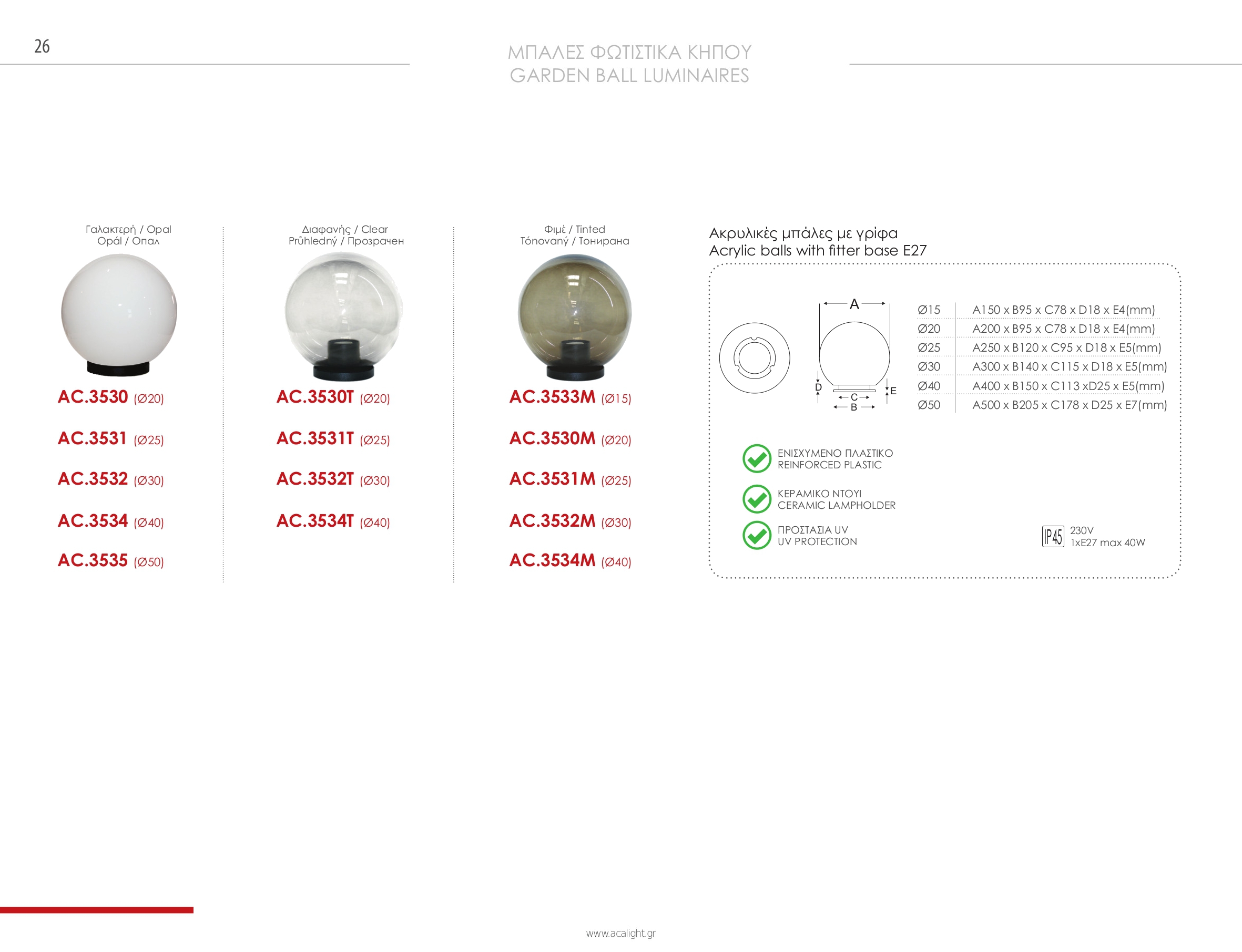 Осветителното тяло AC.3534T ще осигури комфорт и естетика във всяко помещение, в което се постави. Цялостната визия и дизайн на лампата и вложените в изработката й материали, като прозрачен подсилен полимер с UV защита, керамична фасунга, ще допринесат за един неповторим стил. Благодарение на дългогодишния опит, качествените материали и строгия контрол на качеството на изработка на производителя ACA-Lighting (Гърция), AC.3534T е на високо европейско ниво.