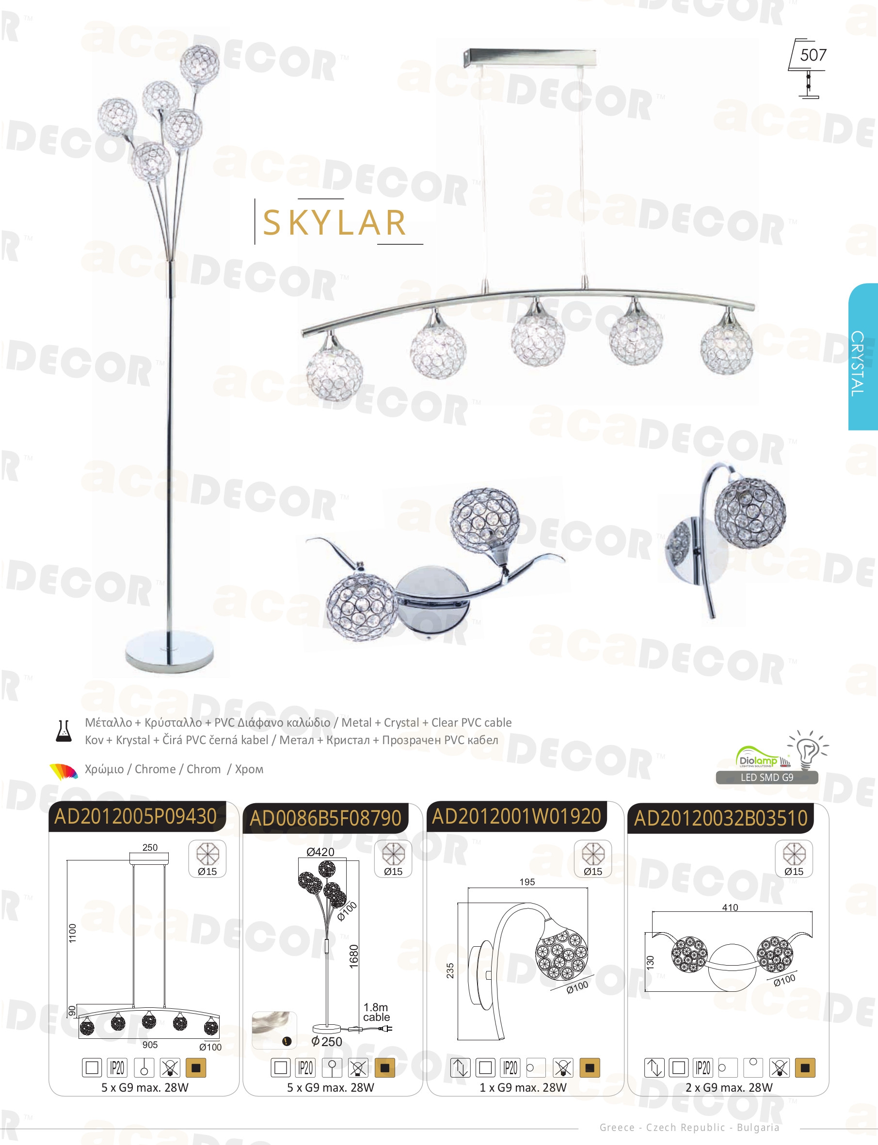 Осветителното тяло AD20120032B ще осигури комфорт и естетика във всяко помещение, в което се постави. Цялостната визия и дизайн на лампата и вложените в изработката й материали, като хромиран метал, прозрачен кристал, ще допринесат за един неповторим стил. Благодарение на дългогодишния опит, качествените материали и строгия контрол на качеството на изработка на производителя ACA-Lighting (Гърция), AD20120032B е на високо европейско ниво.