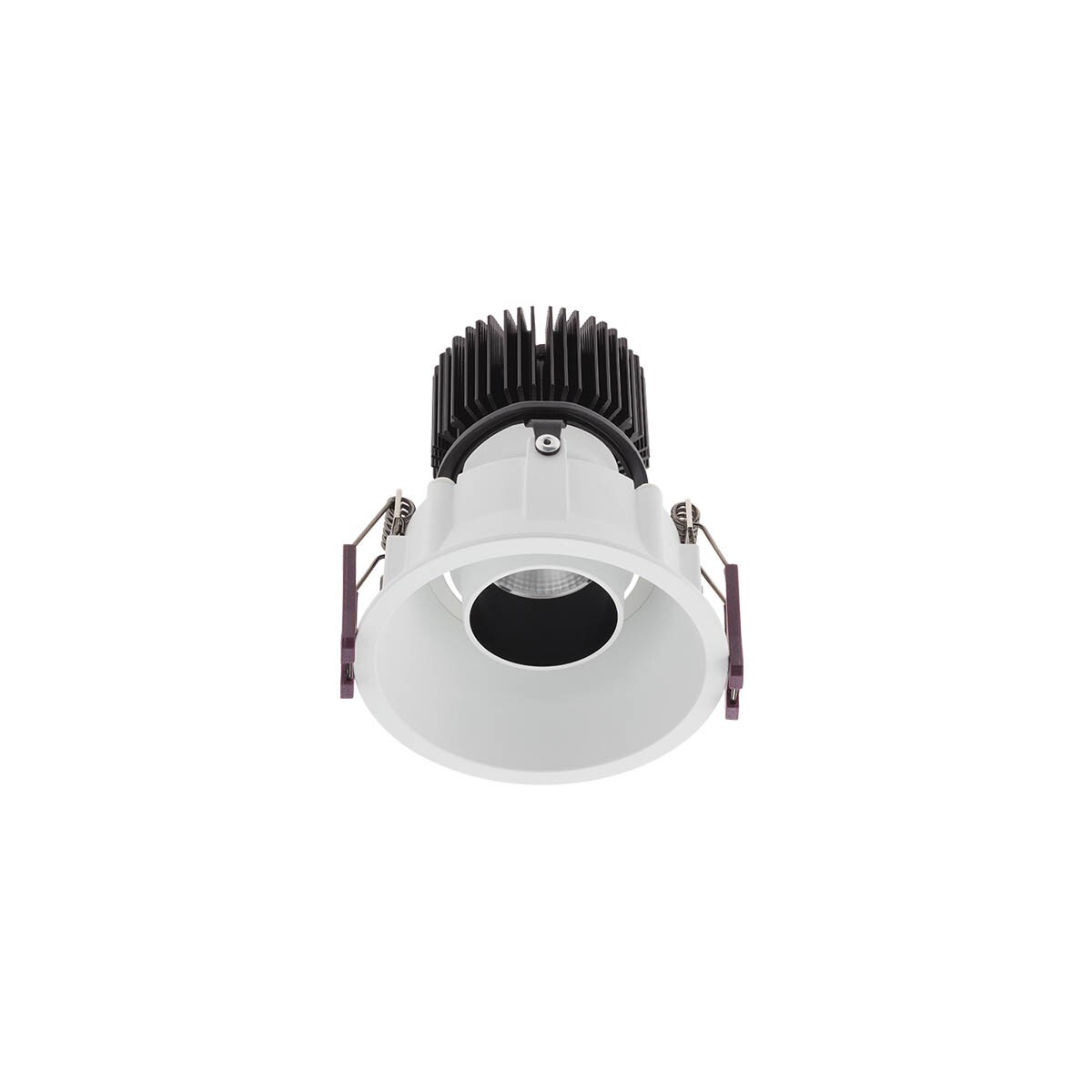 тяло от лят под налягане алуминий в бял цвят, радиатор и кръгъл декоративен пръстен от алуминий в черен цвят, рефлектор от сребрист фасетиран поликарбонат, разсейвател от прозрачен поликарбонат