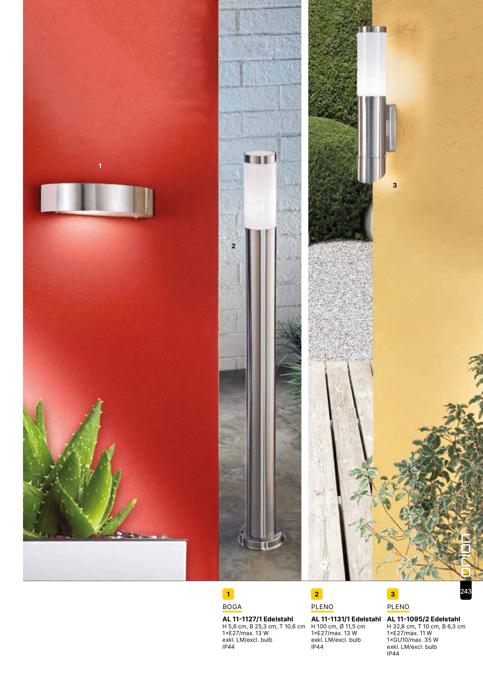 Осветителното тяло AL 11-1127/1 Edelstahl (1xE27) представлява аплик, външна лампа в съвременен стил. AL 11-1127/1 Edelstahl (1xE27) е от категорията осветителни тела и е подходящо за осветяване на различни помещения и пространства като: външно осветление, фасадно осветление.