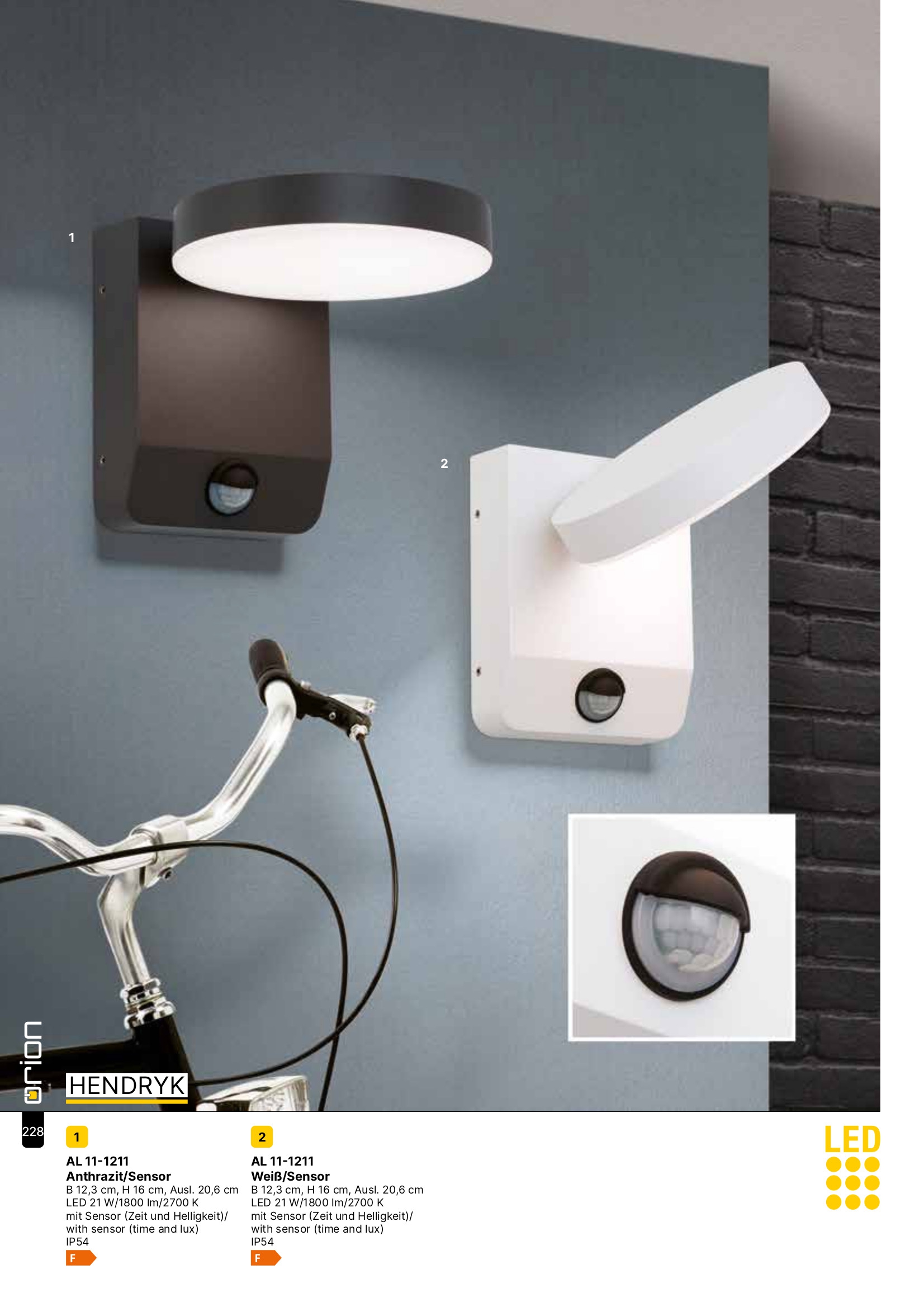 Лед аплик, външна лампа AL 11-1211 wei?/Sensor (LED20W/3000K) ще осигури комфорт и естетика във всяко помещение, в което се постави. Цялостната визия и дизайн на led лампата и вложените в изработката й материали, като алуминий в бял цвят, поликарбонат в бяло, сензор за осветеност с обхват 10m, продължителност на осветяване 0.3 - 3min, ъгъл на засичане 150°, възможност за завъртане на главата, ще допринесат за един неповторим стил. Благодарение на дългогодишния опит в производството на лед осветление, качествените материали и строгия контрол на качеството на изработка на производителя Orion (Австрия), AL 11-1211 wei?/Sensor (LED20W/3000K) е на високо европейско ниво.
