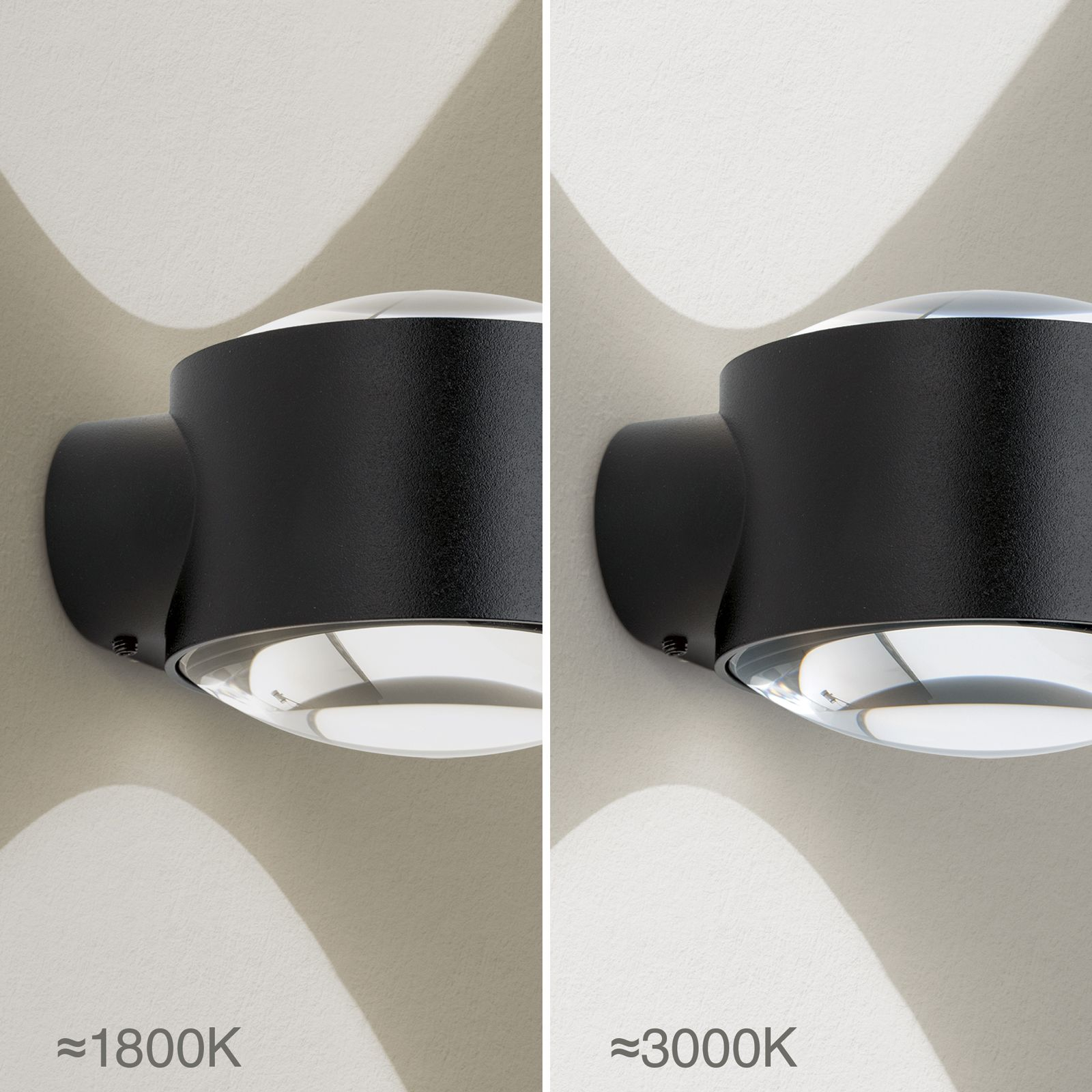 алуминий в черно, стъкло (лупа), светлината е регулируема с DIM до Warm, т.е. при димиране светлината става все по-топла и по-топла, светлина нагоре и надолу