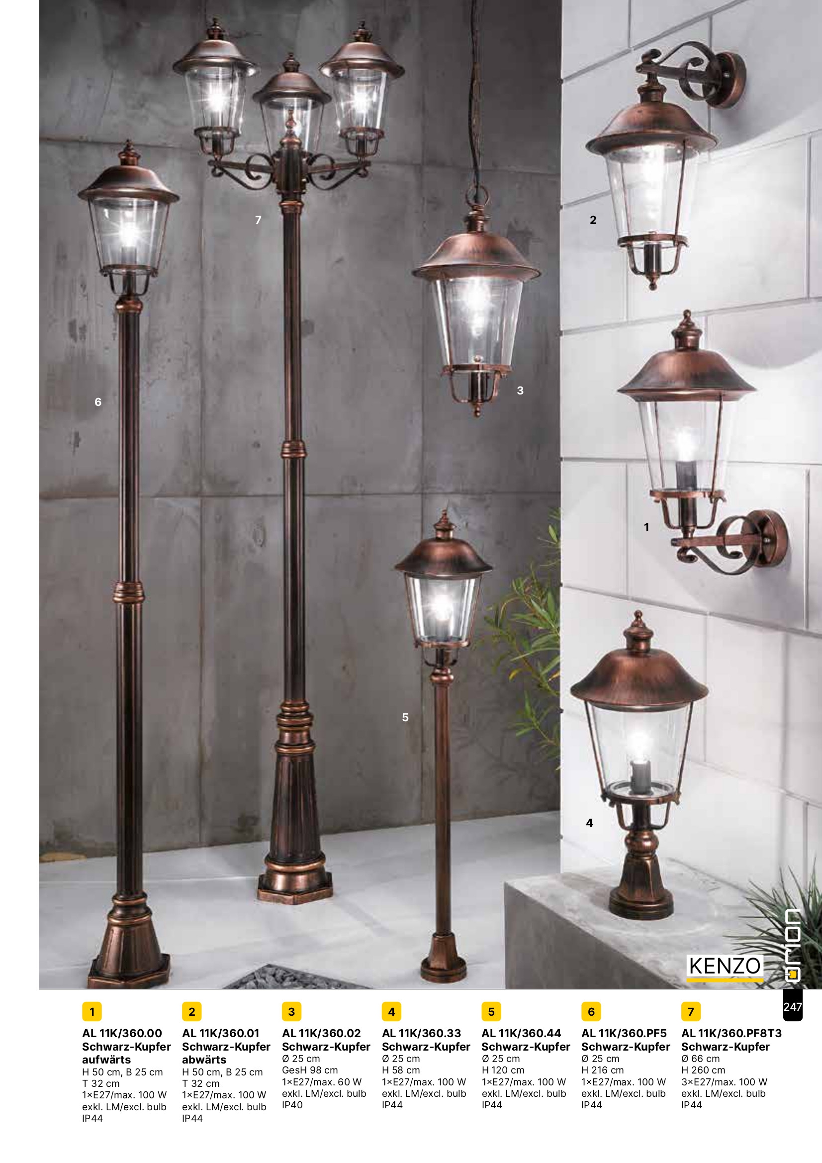 Верига магазини за осветителни тела ОРИОН представя осветителното тяло AL 11K/360.PF5 schw.-kupfer (1xE27), което представлява външна лампа в класически стил. Лампата е част от категорията и е подходяща за осветление на различни помещения и външни пространства, като е особено подходяща, например за градинско осветление, външно осветление.
