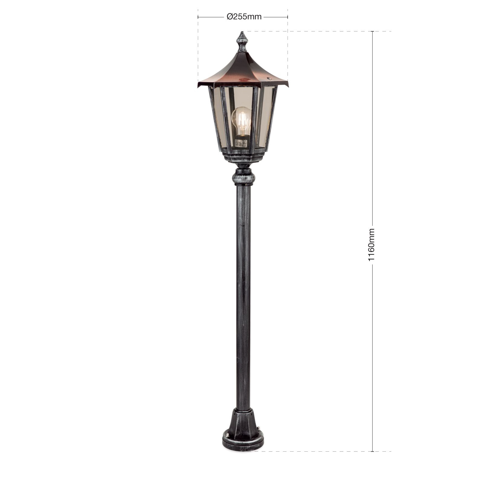 Осветителното тяло AL 11K/82514/A schwarz-silber -Hohe1.16m представлява външна лампа в класически стил. AL 11K/82514/A schwarz-silber -Hohe1.16m е от категорията осветителни тела и е подходящо за осветяване на различни помещения и пространства като: градинско осветление, външно осветление.