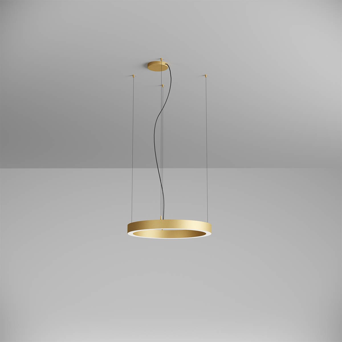eкструдиран алуминиев профил, електростатично обработен с пясъкоструйно покритие в цвят златен сатен, система за окачване с четири усукани стоманени телове, покрити със силикон, разсейватели от сатениран поликатбонат