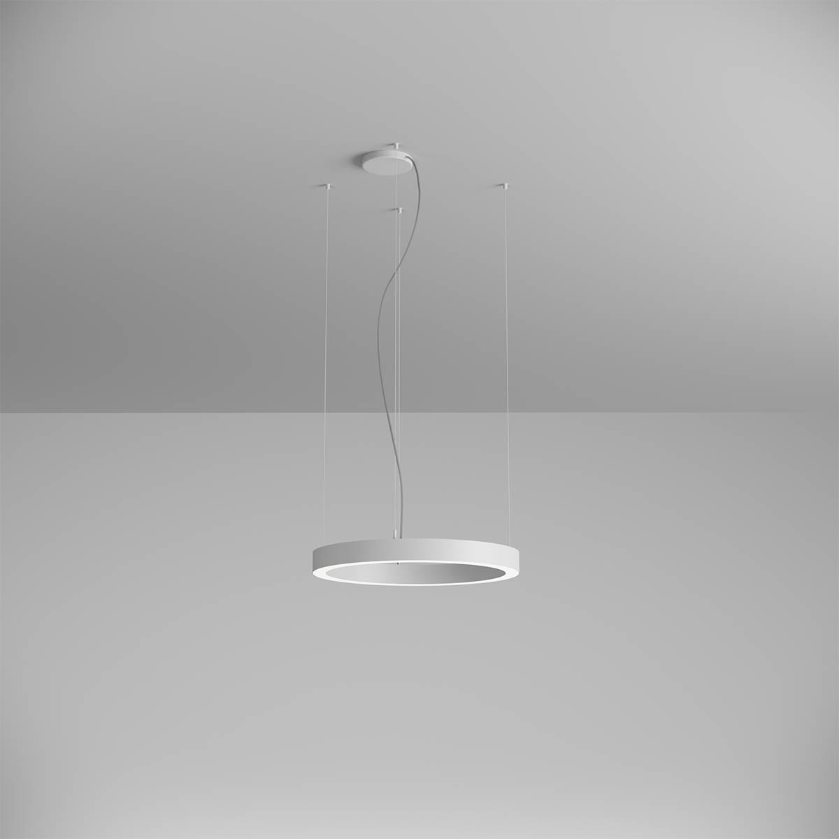 eкструдиран алуминиев профил, електростатично обработен с пясъкоструйно покритие в цвят бял мат, система за окачване с четири усукани стоманени телове, покрити със силикон, разсейватели от сатениран поликатбонат