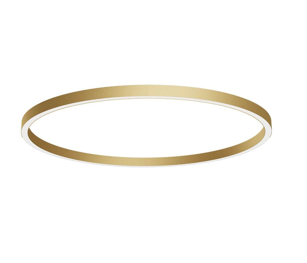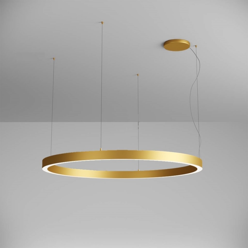 eкструдиран алуминиев профил, електростатично обработен с пясъкоструйно покритие в цвят златен сатен, система за окачване с четири усукани стоманени телове, покрити със силикон, разсейватели от сатениран поликатбонат