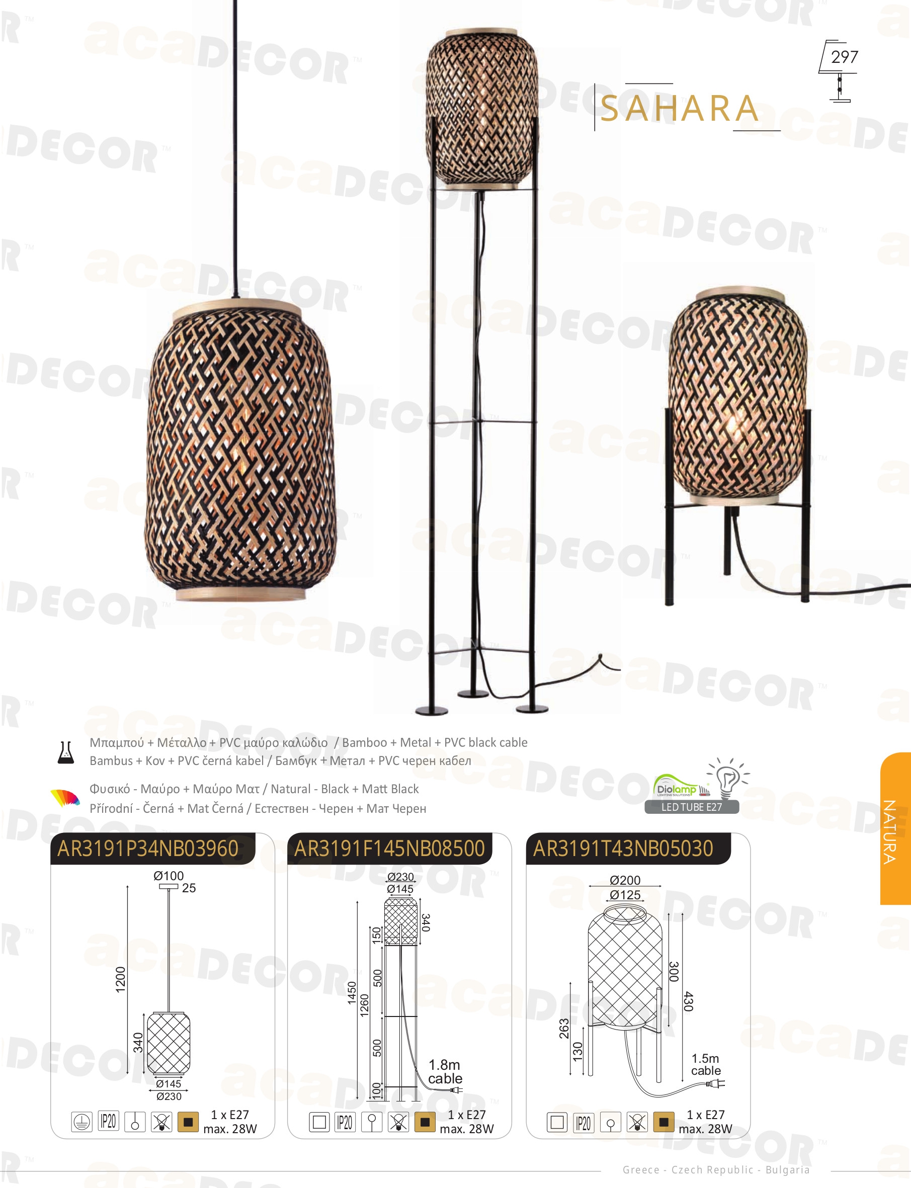 Осветителното тяло AR3191F145NB ще осигури комфорт и естетика във всяко помещение, в което се постави. Цялостната визия и дизайн на лампата и вложените в изработката й материали, като бамбук, метал в матово черен цвят, PVC черен кабел 1.8m, ще допринесат за един неповторим стил. Благодарение на дългогодишния опит, качествените материали и строгия контрол на качеството на изработка на производителя ACA-Lighting (Гърция), AR3191F145NB е на високо европейско ниво.