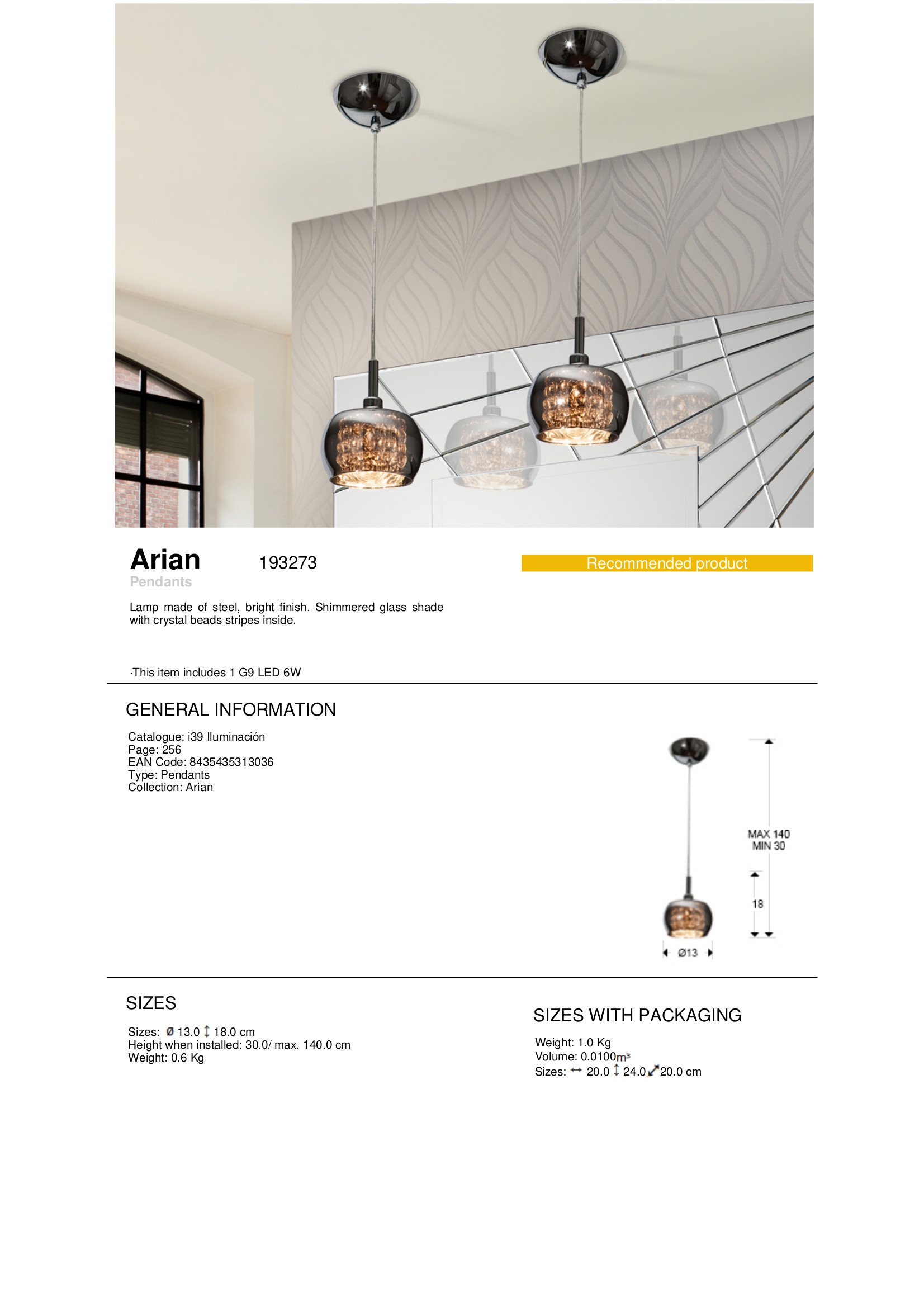 Осветителното тяло 193273 ARIAN 1xG9 ще осигури комфорт и естетика във всяко помещение, в което се постави. Цялостната визия и дизайн на лампата и вложените в изработката й материали, като стомана с огледално покритие, блестящи стъклени абажури с нанизи от кристални мъниста вътре, ще допринесат за един неповторим стил. Благодарение на дългогодишния опит, качествените материали и строгия контрол на качеството на изработка на производителя Schuller (Испания), 193273 ARIAN 1xG9 е на високо европейско ниво.
