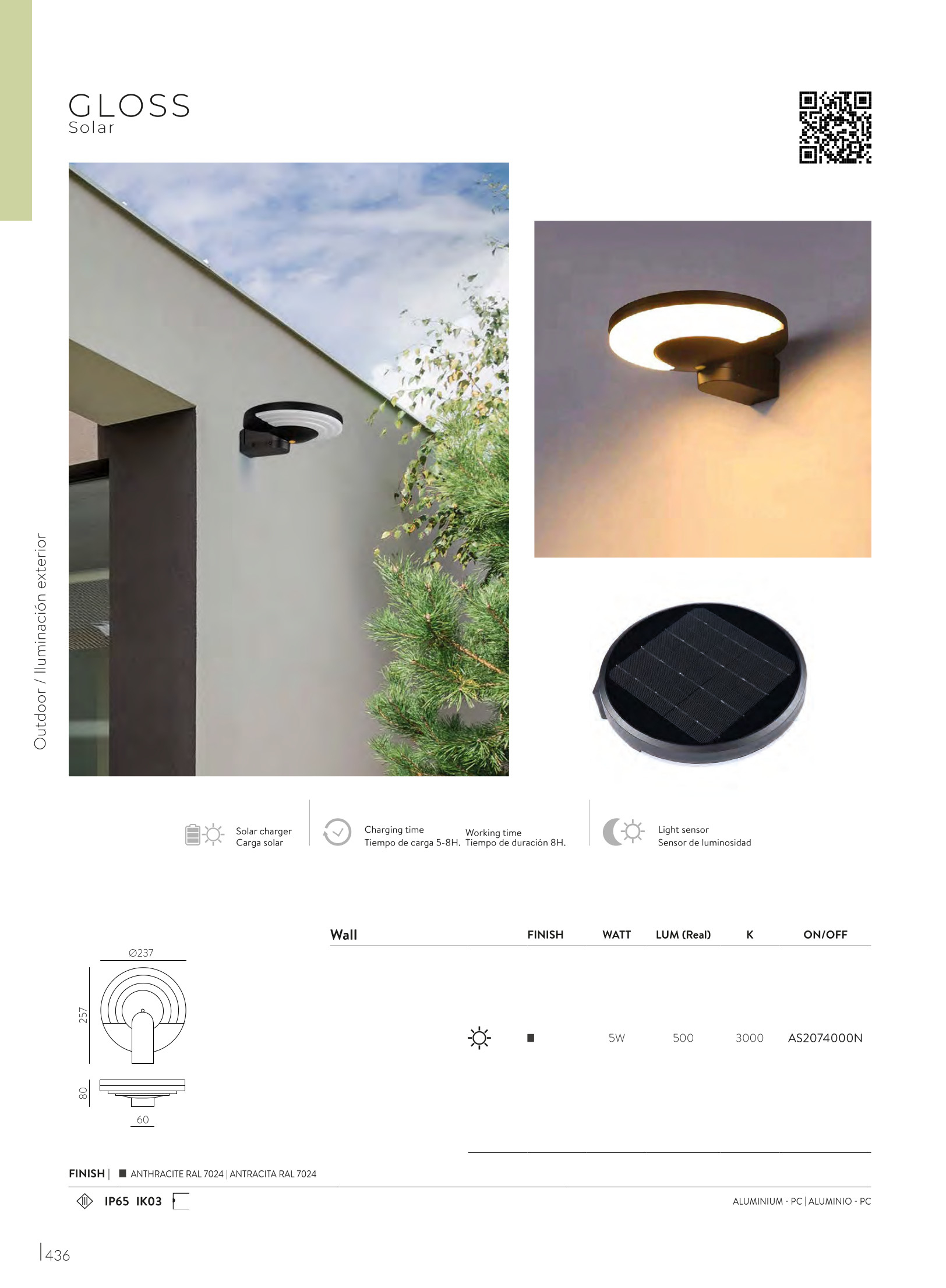 Лед аплик, външна лампа AS2074000N ще осигури комфорт и естетика във всяко помещение, в което се постави. Цялостната визия и дизайн на led лампата и вложените в изработката й материали, като алуминий в цвят антрацит, полимер в бяло, соларно зарядно устройство, сензор за светлина, ще допринесат за един неповторим стил. Благодарение на дългогодишния опит в производството на лед осветление, качествените материали и строгия контрол на качеството на изработка на производителя ACB (Испания), AS2074000N е на високо европейско ниво.