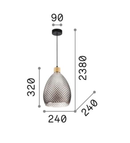 Стилът и естетиката на обстановката ще се обогатят благодарение, както на цялостната визия и дизайн на осветителното тяло, така и на вложените в изработката му, качествени материали, като: метална таванна розетка с черно прахово покритие, детайл от естествено дърво, дифузер от прозрачно духано стъкло с релефен мотив и опушено покритие, захранващ кабел, покрит с текстилна оплетка.